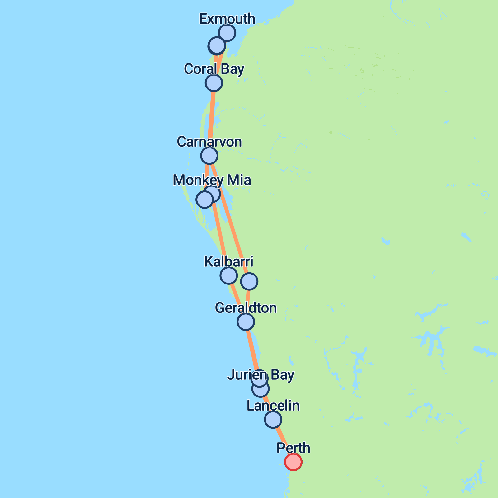 Set off from Perth on a seven day journey showcasing the best of Western Australia’s coastline and outback. Discover the surreal limestone spires of the Pinnacles Desert, the vibrant Pink Lake, and sweeping views from the Kalbarri Skywalk. Dolphin sightings at Monkey Mia and a stroll along Shell Beach highlight the region’s coastal charm. Time in Coral Bay and Ningaloo Reef reveals colourful coral gardens and abundant marine life. Cape Range National Park offers dramatic gorges and pristine shores, while the return leg takes in Carnarvon, Geraldton, Green Head and Lake Thetis before completing the loop back to Perth.