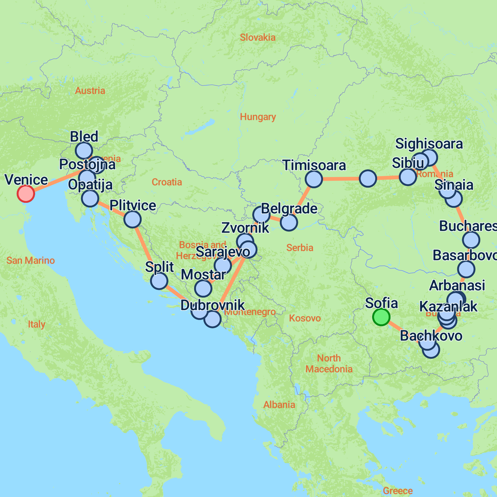 Embark on a 16-day journey starting in Sofia and ending in the enchanting city of Venice. This tour offers a vibrant mix of culture, history, and stunning landscapes as you travel through Bulgaria, Romania, Serbia, Bosnia, Croatia, Slovenia, and Italy. Highlights include exploring the rich heritage of Plovdiv and Bucharest, the medieval charm of Sighisoara and Sibiu, the stunning views of Dubrovnik and Split's Adriatic coast, and the scenic Plitvice Lakes. Youll also discover Lake Bleds serene beauty and conclude with a memorable visit to Venice's famous canals. It's a captivating adventure through Balkan and Adriatic wonders.