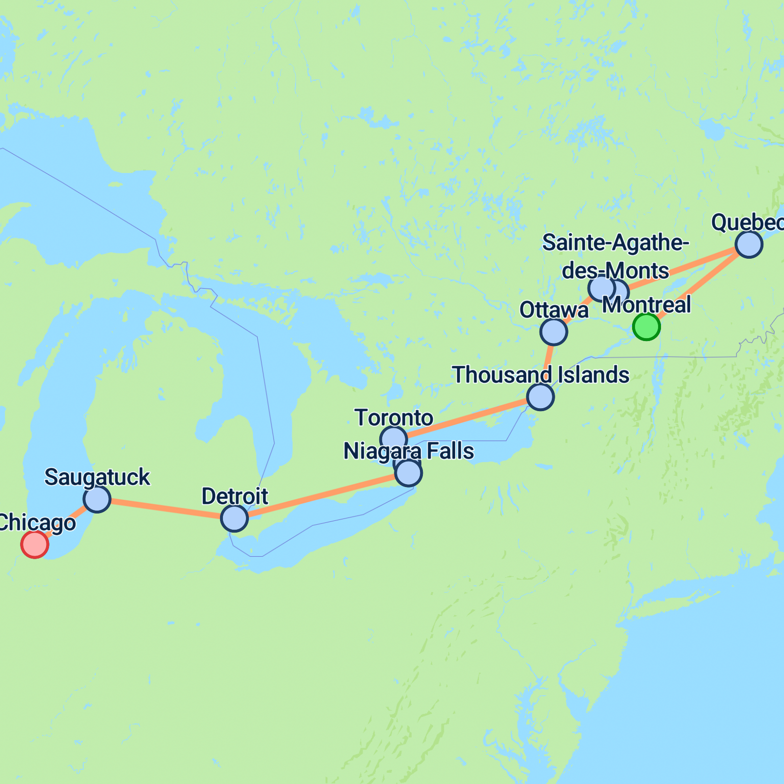 Embark on an 11-day adventure starting in vibrant Montreal and concluding in the bustling city of Chicago. This tour promises an exciting blend of cultural and scenic experiences. Begin by exploring the charms of Montreal and Quebec, with highlights like Mont Royal and the historic Chateaux Frontenac. Then, journey through the stunning Laurentian Hills, visiting quaint towns and the thrilling ski resort of Mont Tremblant. In Ottawa, witness the Changing of the Guard before cruising through the beautiful Thousand Islands en route to Toronto. Experience the splendour of Niagara Falls, and dive into the lively urban landscapes of Detroit and Chicago, soaking up iconic sights like the Willis Tower and Navy Pier.