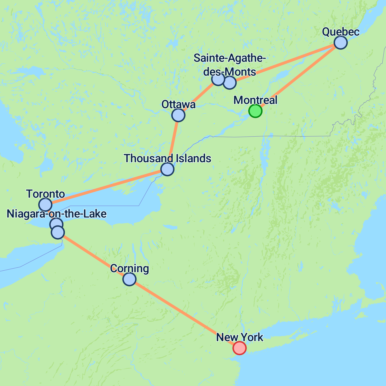 Embark on a remarkable 10-day journey from Montreal to New York, exploring some of North America's most iconic destinations. Kick off with a tour around Montreal's charming streets before heading to Quebec to admire places like Chateaux Frontenac. Travel through the picturesque Laurentian Hills, passing through quaint towns like Sainte-Agathe-des-Monts and Mont Tremblant. Discover Ottawa's historic sites and enjoy a scenic cruise among the Thousand Islands. In Toronto, explore lively neighbourhoods and towering skyscrapers. Experience the majestic Niagara Falls on a thrilling boat ride. Wrap up in New York, exploring the vibrant streets of Manhattan and soaking in the citys pulsating energy.
