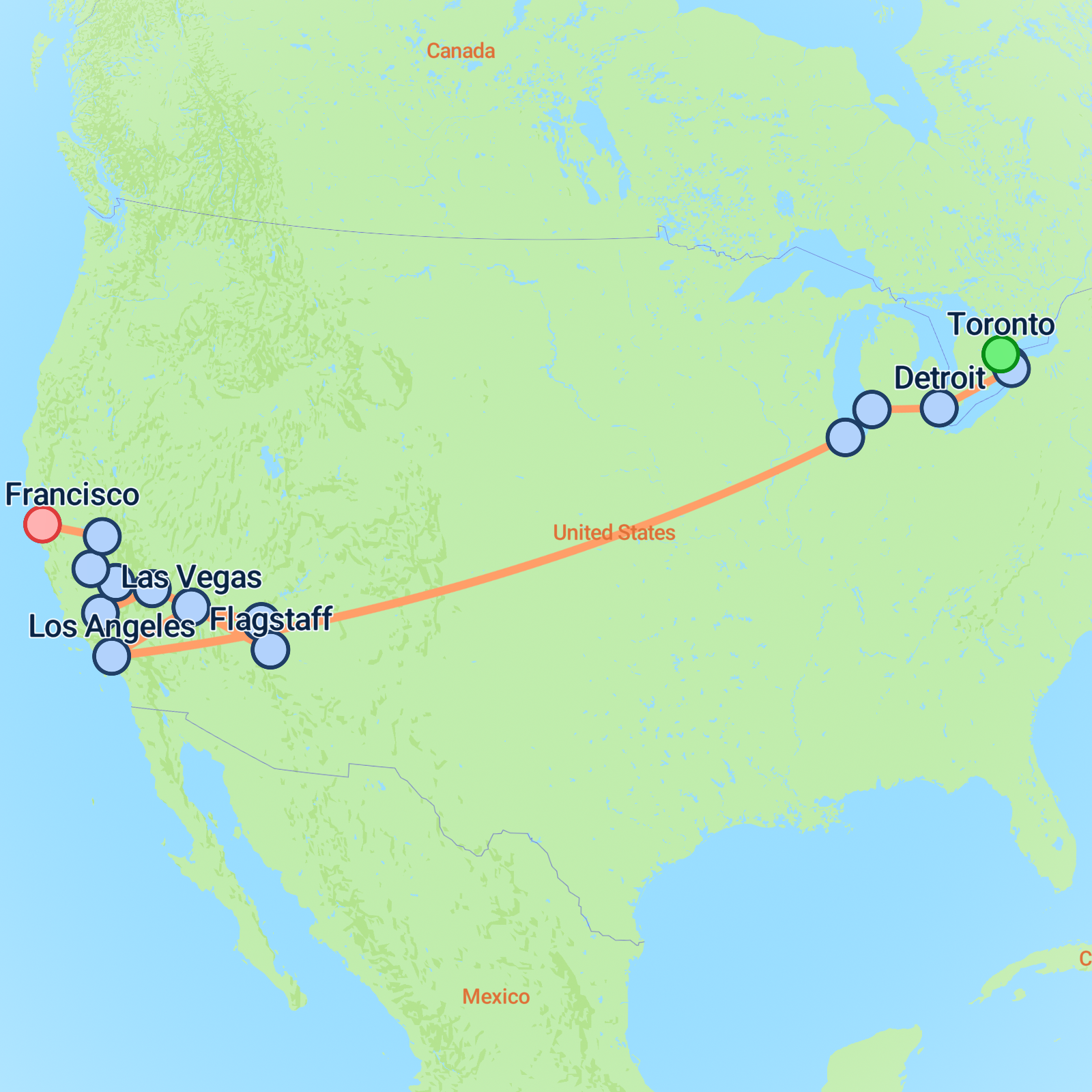 Embark on a captivating 16-day journey from Toronto to San Francisco, traversing diverse landscapes and iconic cities. Kick off in Toronto, where you'll explore vibrant neighbourhoods and landmarks before heading to the breathtaking Niagara Falls. As you cross into the United States, discover the vibrant cityscapes of Chicago and the entertainment capital of Los Angeles. You'll experience the glitz of Las Vegas, the awe-inspiring Grand Canyon, and the rugged beauty of Death Valley. The adventure continues through Sequoia and Yosemite National Parks, offering majestic forests and stunning mountain vistas, before concluding in the picturesque streets of San Francisco. This tour promises a blend of natural wonders and urban excitement, perfect for any traveller.
