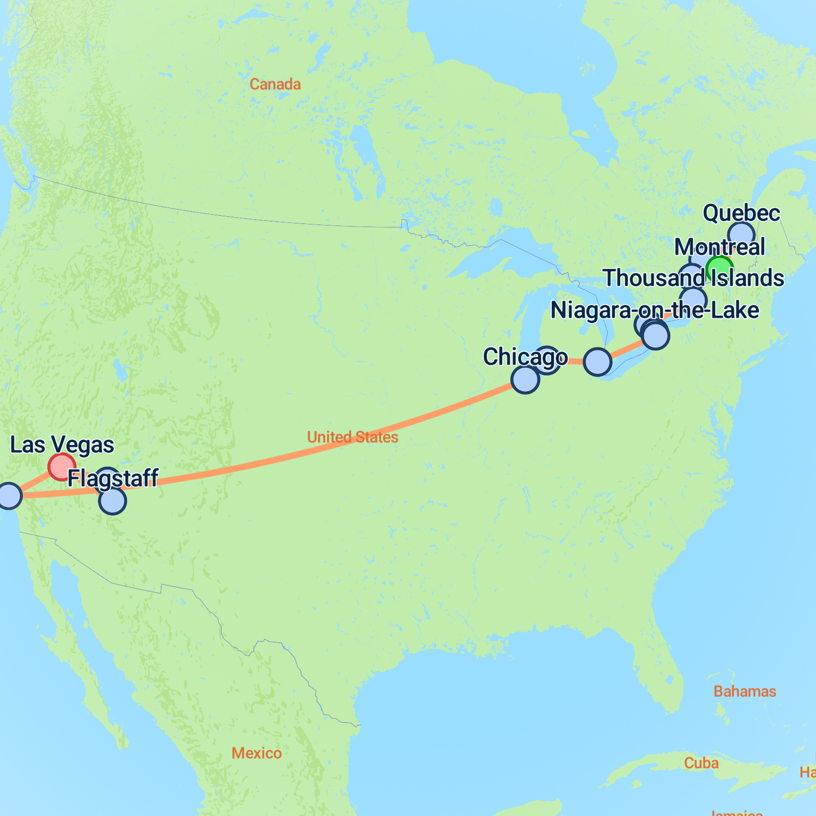 Embark on an exhilarating 16-day adventure beginning in Montreal and concluding in the vibrant city of Las Vegas. Expect to see the charming streets of Quebec and the stunning Montmorency Falls as you journey through Canada. Witness the awe-inspiring Thousand Islands from a river cruise, and explore Toronto's highlights like Chinatown and the CN Tower. Experience the majesty of Niagara Falls aboard the Hornblower Cruise. In the US, drift through Chicago's architectural wonders, soak up the glitz of Los Angeles, and stroll along Hollywood Boulevard. Cap off your journey with the breathtaking Grand Canyon before winding back to Las Vegas for a dazzling finale.