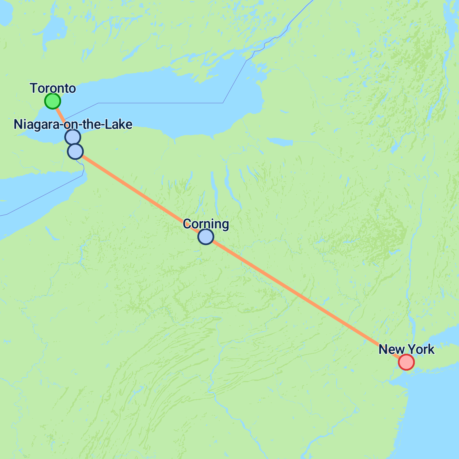 Embark on a thrilling 6-day adventure starting in Toronto and concluding in the vibrant city of New York. Dive into Toronto's cultural blend as you explore its diverse neighbourhoods, iconic landmarks like City Hall, and even the lively Queens Quay. Journey onwards to the majestic Niagara Falls, and enjoy a memorable cruise to the foot of the falls. On your way to New York, pause in Corning to witness the world's largest collection of glass art. Once in New York, immerse yourself in its iconic attractions from Times Square's dazzling lights to Central Park's tranquillity. Experience the best of urban charm and natural splendour.