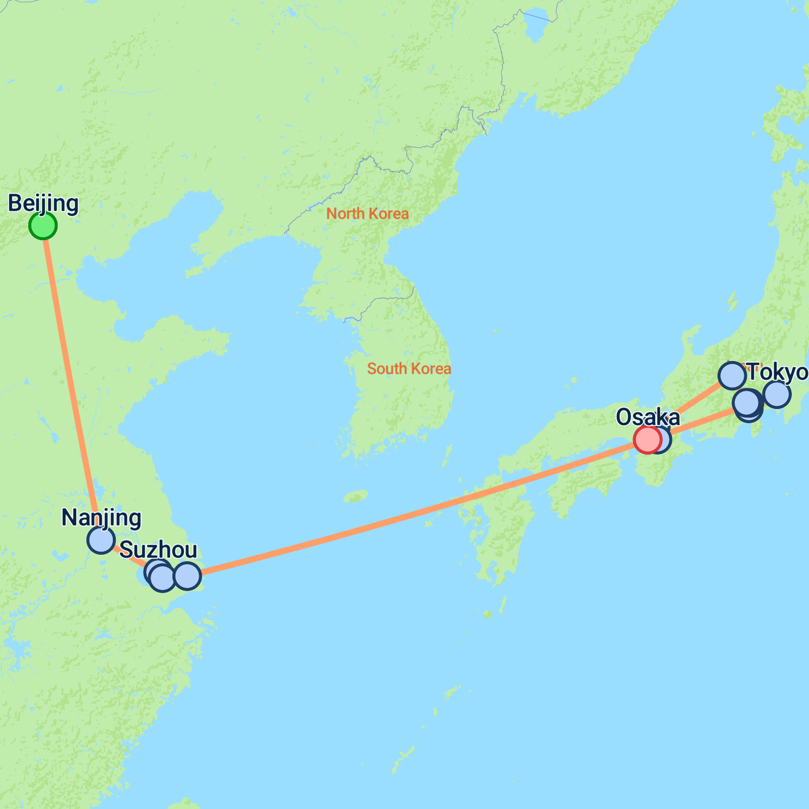 Embark on this thrilling 13-day journey from Beijing to Osaka, where vibrant cities meet stunning landscapes and rich traditions. Begin in Beijing, exploring the Great Wall and the Forbidden City, before experiencing the modern energy of Nanjing and the tranquil gardens of Suzhou. Wander through Shanghais bustling streets and take in panoramic views from the iconic Pearl Tower. Fly to Tokyo, where skyscrapers and serene temples coexist beautifully. The charm of Mount Fuji and traditional ryokan stays await in Kawaguchiko, followed by the historic allure of Kyoto and Nara. Conclude your adventure in Osaka, revelling in its spirited nightlife and cultural hotspots.