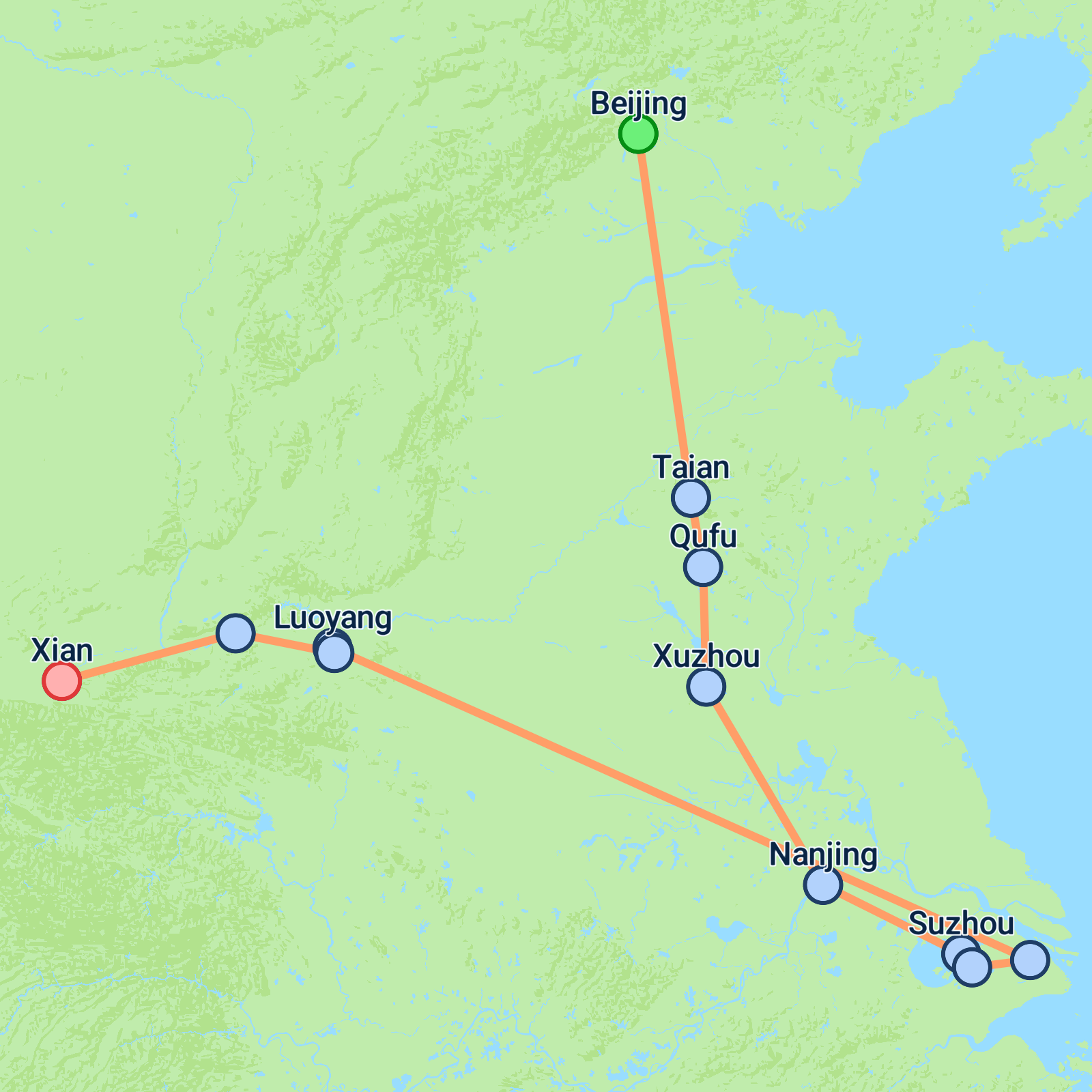 Embark on a memorable 12-day adventure beginning in Beijing and concluding in Xian, revealing the captivating essence of China. Dive into Beijing's vibrant life with explorations of the Forbidden City, the majestic Great Wall, and the tranquil Hutong neighbourhoods. Journey aboard high-speed trains to Taian, Qufu, and onwards, immersing in spiritual and historical wonders like Mount Taishan and the Confucius Temple. En route to Shanghai, experience the quaint water town of Tongli and the iconic gardens of Suzhou. Shanghai dazzles with its mix of tradition and modernity. Finally, the ancient Terracotta Army and lively streets of Xian offer a fitting finale to this epic journey.