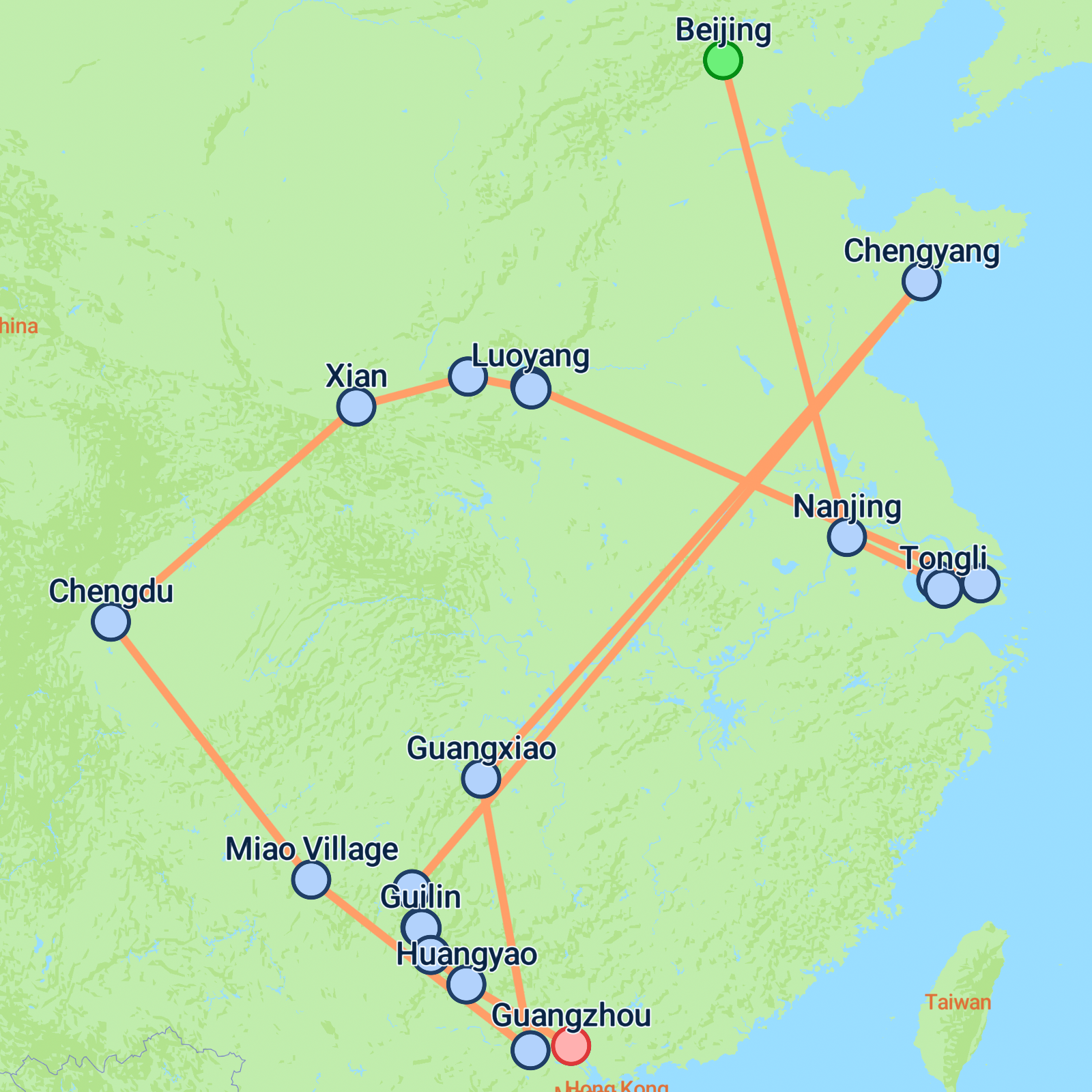 Your adventure begins in the bustling city of Beijing and takes you on a 16-day journey through China's rich tapestry of history and culture, concluding in the vibrant metropolis of Guangzhou. From the architectural wonder of the Great Wall and the imperial grandeur of the Forbidden City to the serene beauty of the Summer Palace, Beijing sets the stage for your Chinese odyssey. Travelling at breathtaking speeds on high-speed trains, youll explore Nanjing's Purple Mountain, Suzhous classical gardens, and the waterways of Tongli. In Xian, marvel at the ancient Terracotta Army, and in Chengdu, get up close with playful pandas. Traverse through traditional villages and scenic landscapes as you head south to Guilins picturesque river cruise and the lively streets of Yangshuo. Your journey wraps up in the bustling heart of Guangzhou, where tradition meets modernity. This tour offers an unforgettable swirl of experiences, from majestic historical sites to the charm of rural China.