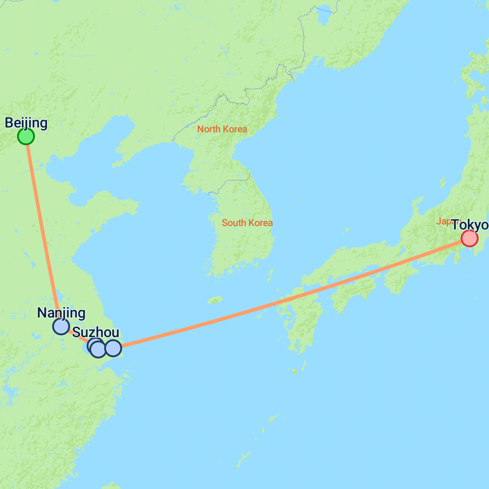 Embark on an unforgettable 9-day adventure starting in the bustling city of Beijing and ending in the vibrant metropolis of Tokyo. Explore the wonders of China, including the Great Wall at Mutianyu, the historical Forbidden City, and the charming water town of Tongli. Discover the vibrant arts scene of Beijing and the exquisite classical gardens of Suzhou. Travel by high-speed train to Nanjing and experience the thrill of Shanghai's modern skyline mixed with its colonial past. In Tokyo, embrace the fusion of tradition and innovation as you visit iconic landmarks like Shibuya Crossing and the serene Meiji Shrine. Expect a perfect blend of cultural immersion and modern exploration.