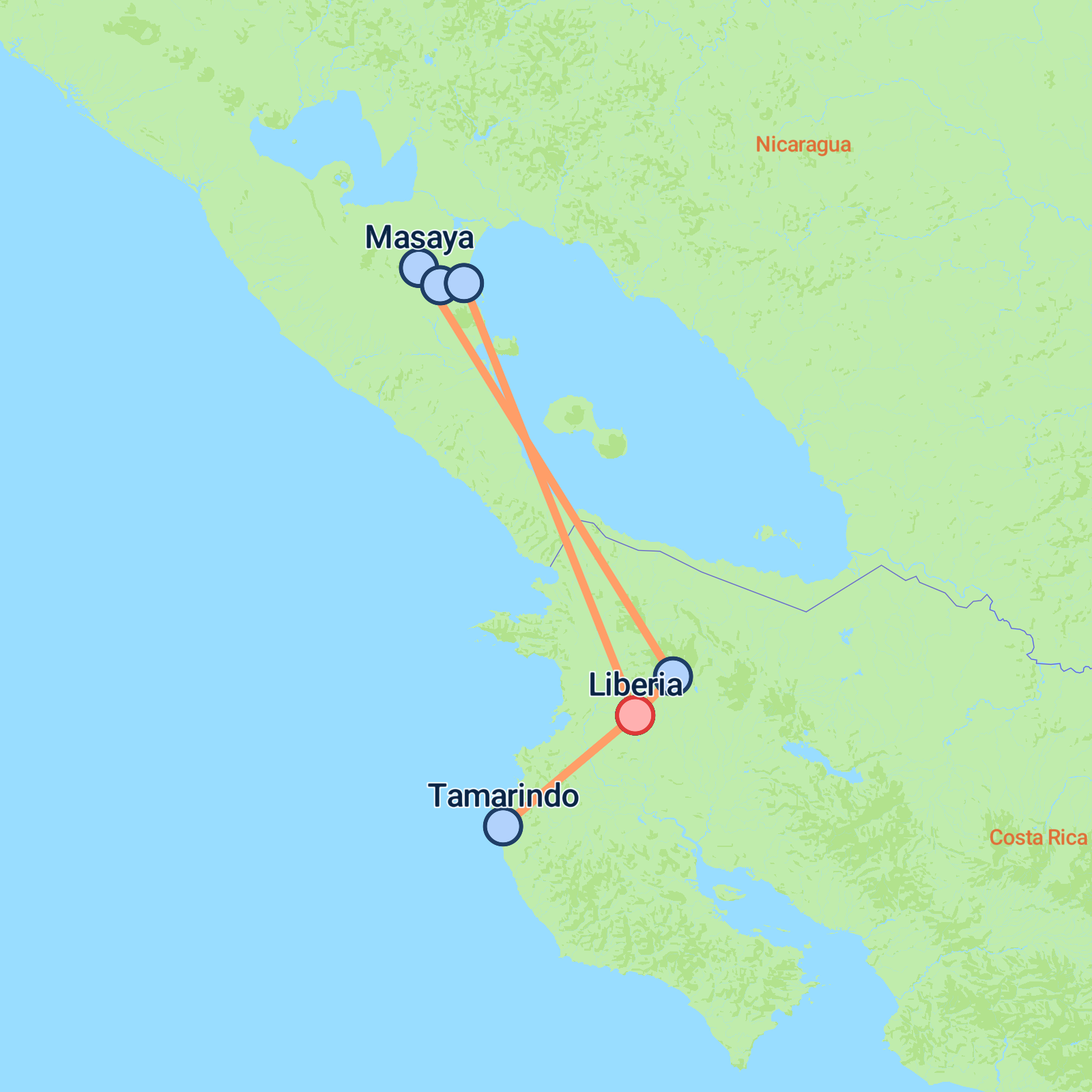 Granada (Nicaragua) - Liberia (Costa Rica) - Tamarindo. This morning, you’ll travel south towards the Costa Rican border. As you cross into a new country, the scenery begins to shift—passing volcanic highlands, open plains, and rural villages en route to the Pacific coast. You'll soon enter the tropical dry forests and sweeping savannahs of Guanacaste Province, a region known for its warm climate and cowboy culture.