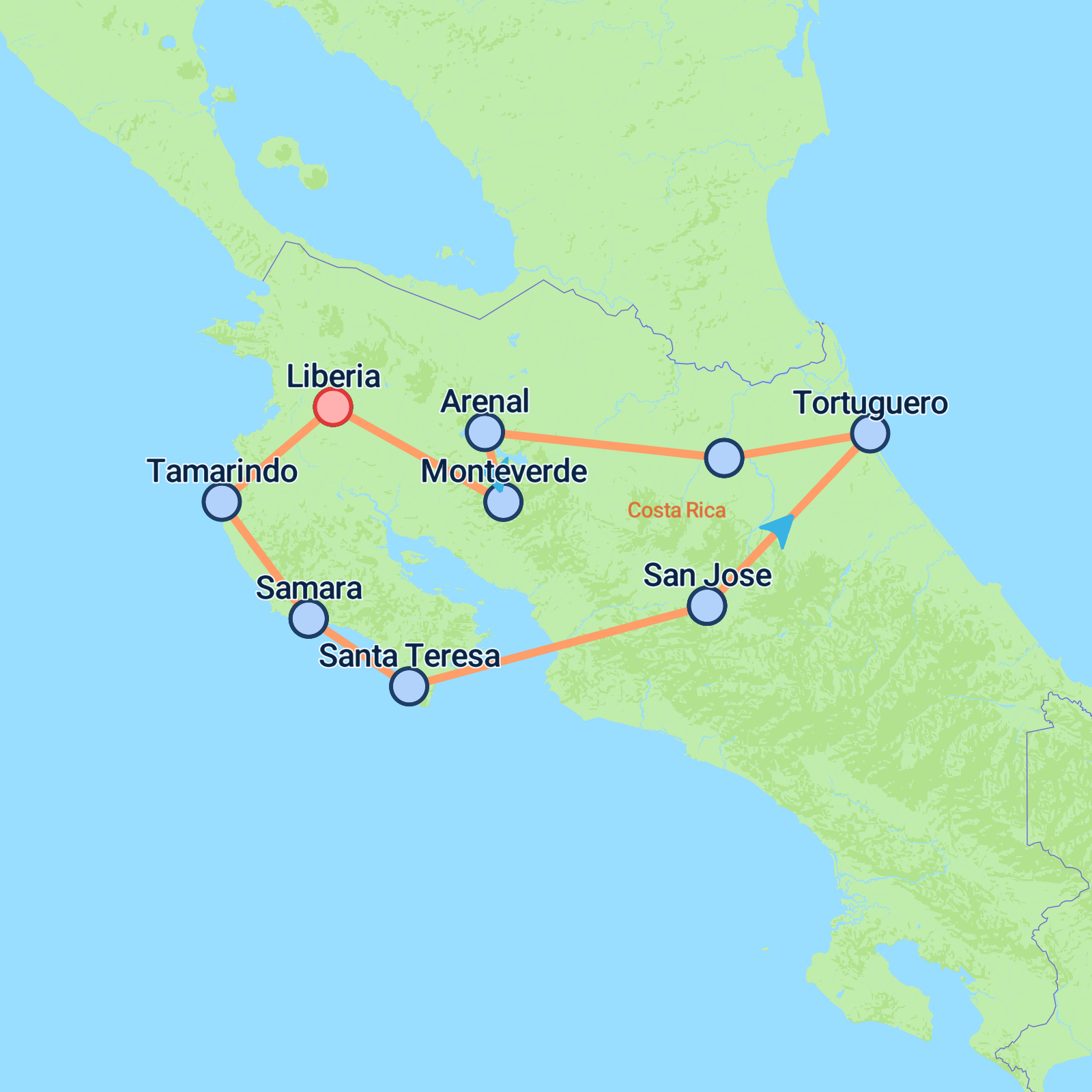 This 15-day tour starts in Liberia and finishes back there, offering a fantastic blend of beach vibes, rainforest adventures, and cultural experiences. Youll kick off with relaxing beach days in Tamarindo, Smara, and Santa Teresa perfect for soaking up the sun or catching some waves. Then, explore the vibrant capital, San Jos, before heading to Tortugueros lush canals and wildlife. The journey continues through Sarapiqus rainforest, Arenals volcano and hot springs, and the misty Monteverde Cloud Forest. Expect a great mix of nature, wildlife spotting, optional adrenaline activities, and plenty of time to unwind in stunning surroundings.
