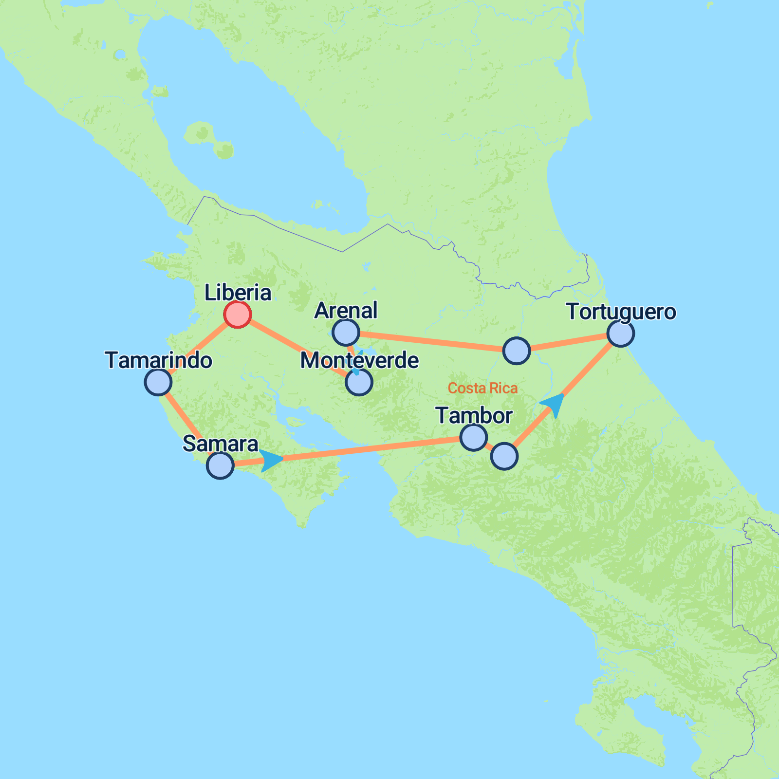 This 15-day tour starts in Liberia and finishes back there, offering a fantastic blend of beach time, wildlife, and adventure. Youll unwind on stunning Pacific beaches like Tamarindo, Samara, and Tambor before heading to the vibrant capital, San Jos. Then its off to Tortugueros lush canals for wildlife spotting and village life. The journey continues through the rainforest of Sarapiqui with optional rafting and chocolate tours, followed by Arenals volcano views and thrilling canopy tours. Finally, explore the misty Monteverde Cloud Forest with its incredible biodiversity before returning to Liberia. Expect a perfect mix of relaxation, nature, and culture throughout.