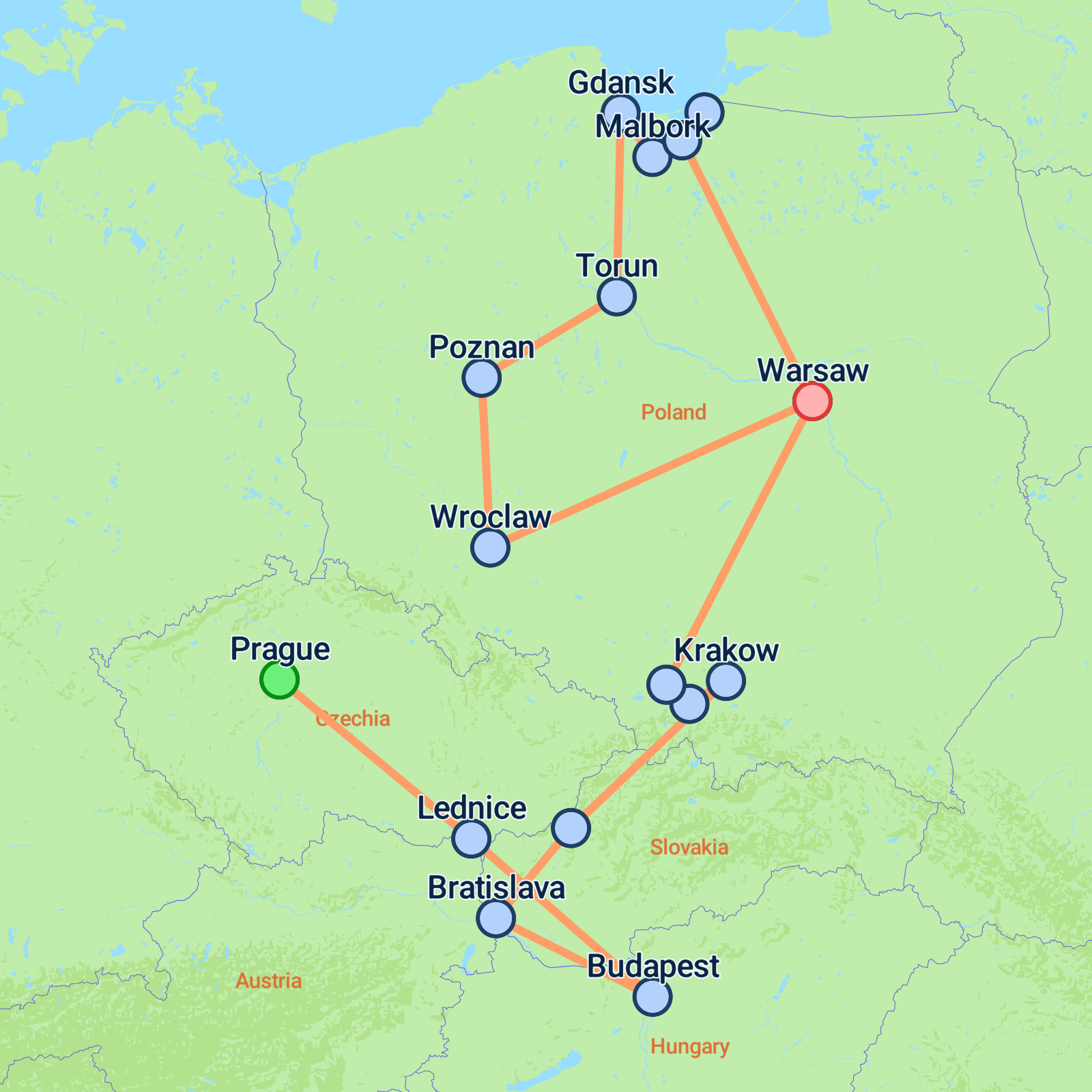 Embark on a captivating 12-day journey starting in the fairy-tale city of Prague and culminating in the vibrant capital of Poland, Warsaw. Explore the charms of Prague with its stunning Castle and Charles Bridge. Venture through the Moravia region to the UNESCO-listed Lednice, before crossing into Hungary to experience the lively atmosphere of Budapest. In Slovakia, Bratislava and Trencin await with their medieval allure. Discover Krakow's medieval heart and visit the poignant Auschwitz-Birkenau. Warsaw enchants with its mix of modernity and history, while Wroclaw, Poznan, and Gdansk offer unique historical insights and picturesque views. Expect to see impressive castles, UNESCO sites, and vibrant cultural centres with a blend of leisurely exploration and guided experiences.