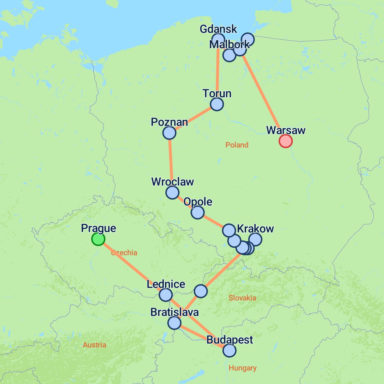 Embark on a captivating 13-day adventure from Prague to Warsaw, blending history and culture with stunning landscapes. Begin your journey in the enchanting streets of Prague, exploring iconic sites like Prague Castle and Charles Bridge. Wander through the gardens of Lednice, cross into Hungary, and soak up Budapest's vibrant charm. Discover Bratislava and the medieval allure of Trencin, before reaching Krakow's UNESCO-listed Old Town. Engage with history at Auschwitz and experience the rich heritage of Wroclaw and Gdansk. Traverse picturesque Poland, marvelling at Malbork Castle and the Elblag Canal, before concluding in Warsaw's lively centre. Expect unforgettable memories and diverse experiences throughout.