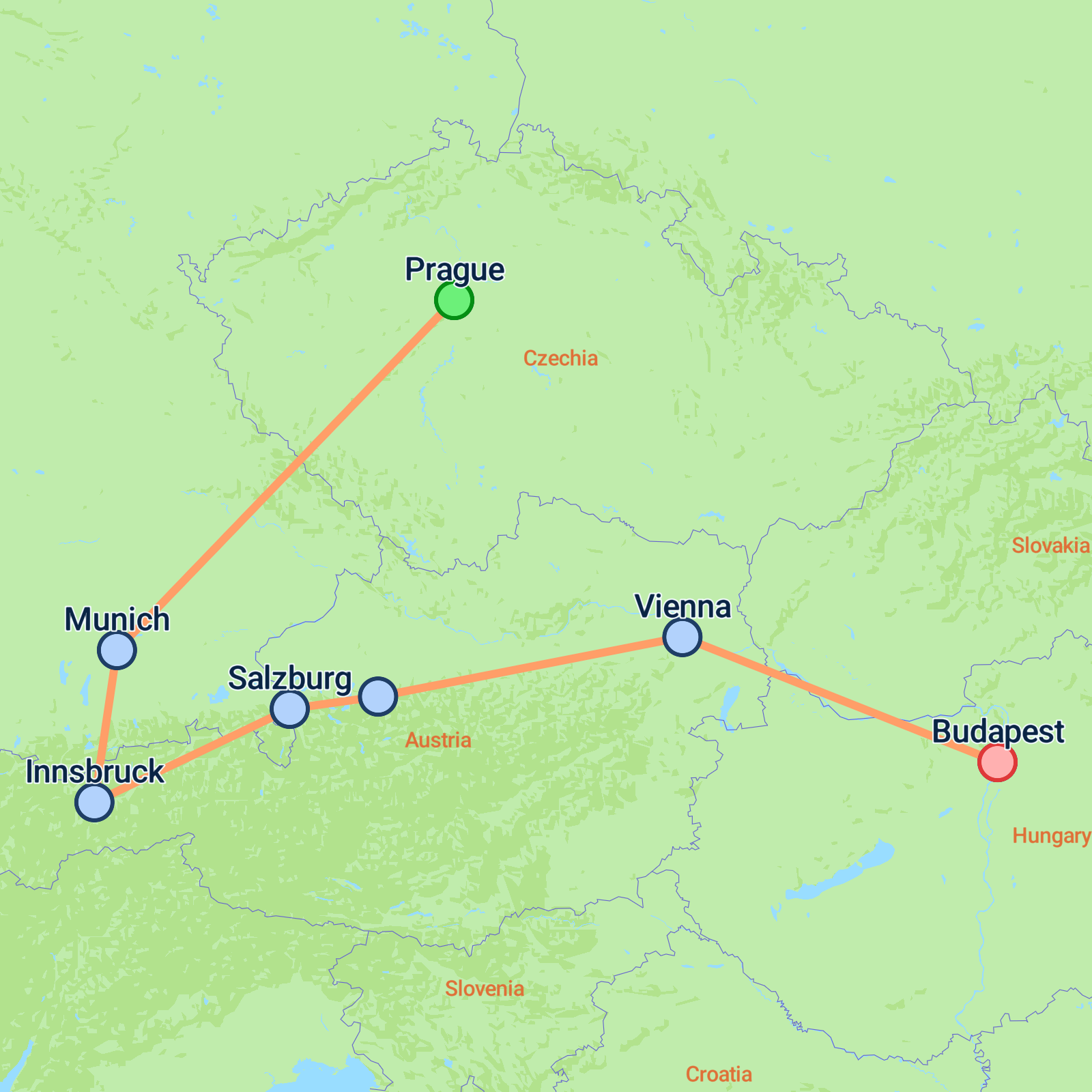 Start in the enchanting city of Prague on this eight-day tour and experience the best of Central Europe. Youll explore the stunning architecture of Prague, including a guided tour of the magnificent Prague Castle and a relaxing boat ride on the Vltava River. Journey to Munich to savour its historic charm before heading off to the alpine beauty of Innsbruck. Visit the fascinating Swarovski Museum, and discover the picturesque town of Kitzbhel. Explore Mozarts enchanting Salzburg and cruise Lake Traunsee before arriving in the cultural hub of Vienna. Finally, soak in the vibrant culture of Budapest with a scenic Danube River cruise. Finish your adventure with unforgettable memories in Budapest.