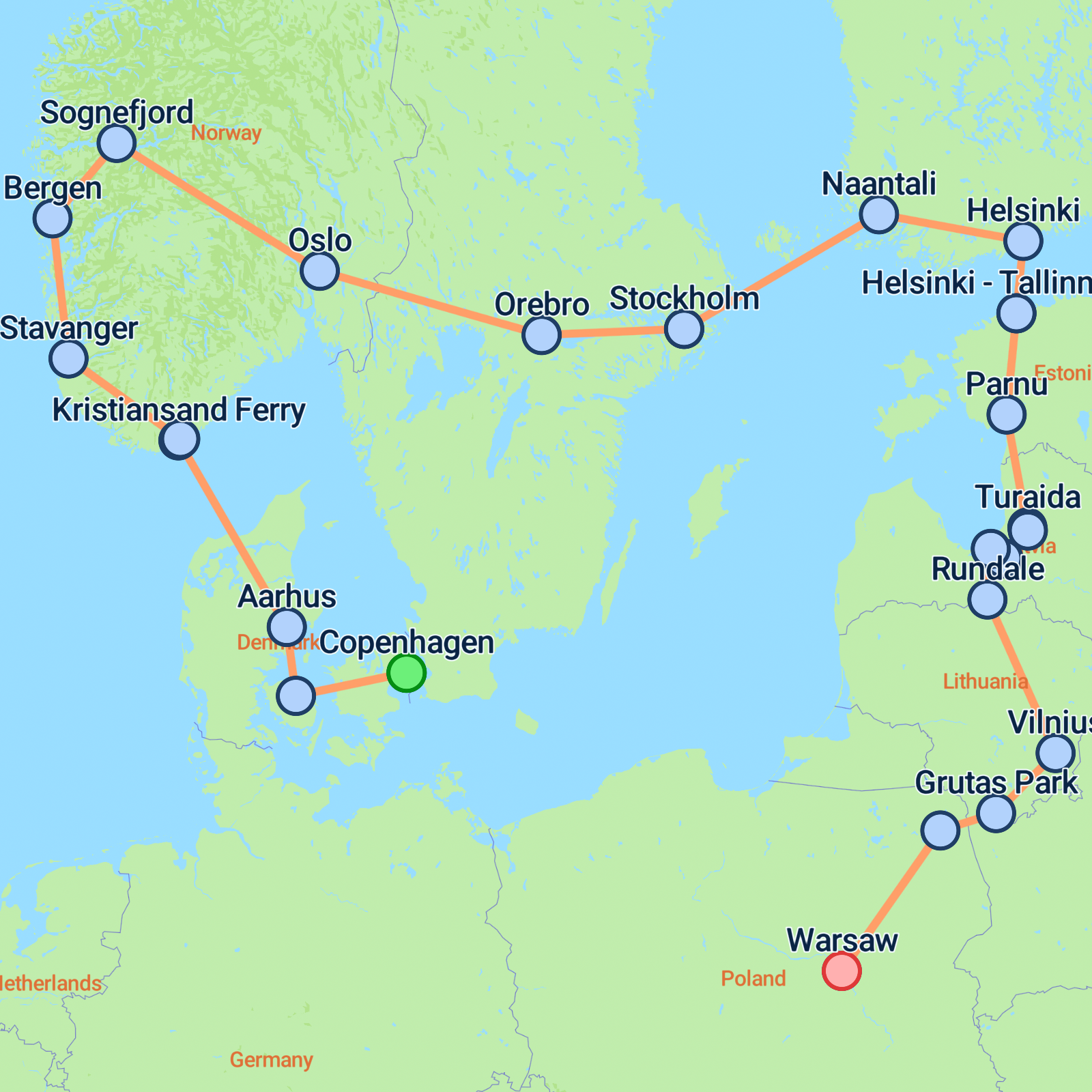 Get ready for an unforgettable 17-day journey, kicking off in Copenhagen and wrapping up in the vibrant city of Warsaw. This exciting tour will take you through the heart of Scandinavia and the Baltic region, offering a blend of culture, history, and stunning landscapes. Highlights include exploring Copenhagen and Aarhus, a scenic ferry ride to Kristiansand, driving through Norway's fjords to Bergen, and sightseeing in Oslo and Stockholm. You'll encounter historic castles in Turku, Turaida, and Trakai, and wander through charming cities like Riga and Vilnius. Expect mesmerising landscapes, a peek into medieval times, and vibrant city life along the way. This adventure is not to be missed!