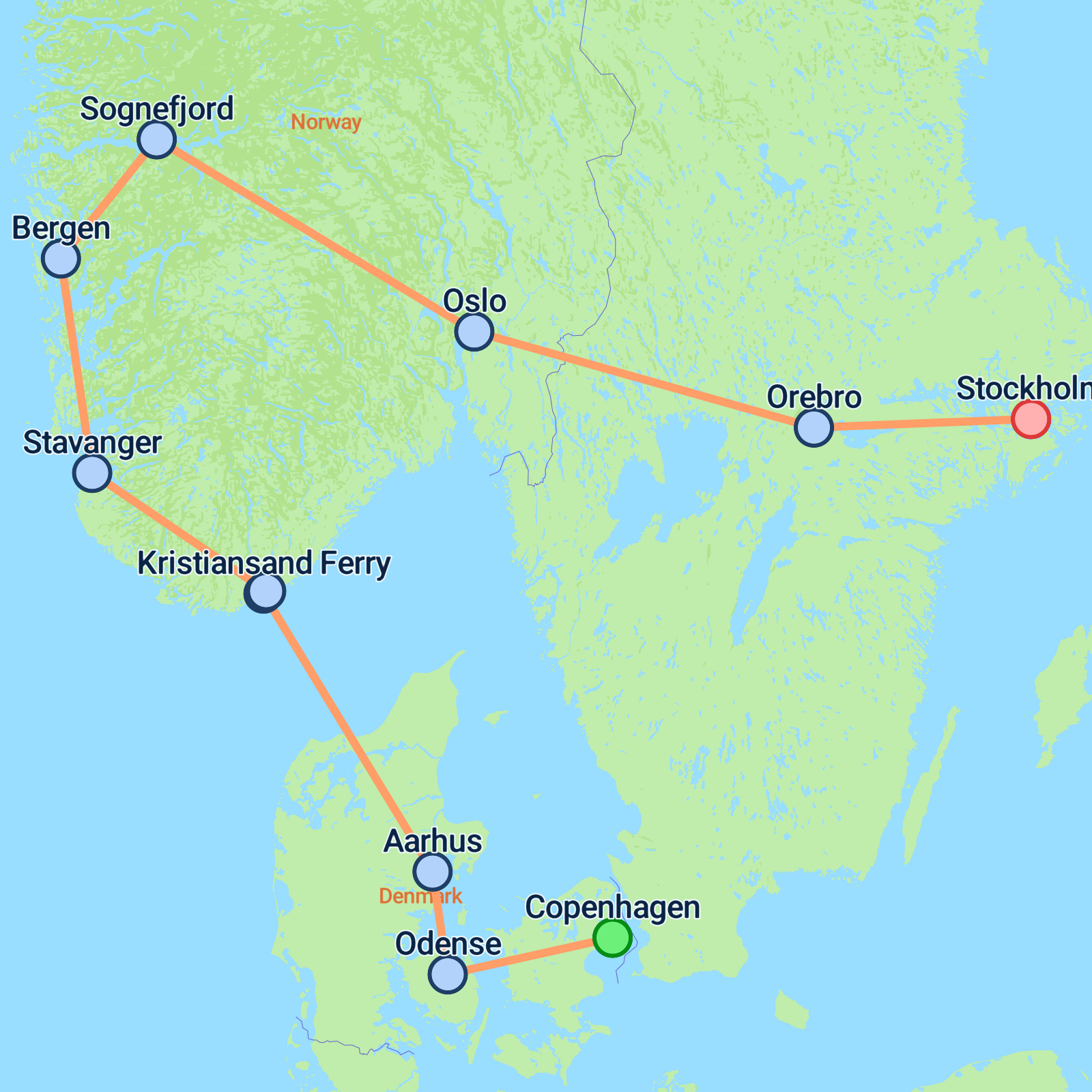Embark on an 8-day adventure starting in Copenhagen and ending in the captivating city of Stockholm. Your journey begins with a scenic tour of Copenhagen, where you'll explore its iconic sites like Tivoli Gardens and the Little Mermaid statue. Cruise across the North Sea to Norway, where the dramatic fjord landscapes and charming towns like Stavanger await. Delight in a panoramic view of Bergen from Mount Flyen's cable car and witness the stunning Sognefjord and Tvindefossen Waterfall. Experience Oslo's artistic vibe before heading into Swedens lush settings, stopping at historic rebro. Wrap up in Stockholm, discovering Gamla Stan and endless cultural gems.