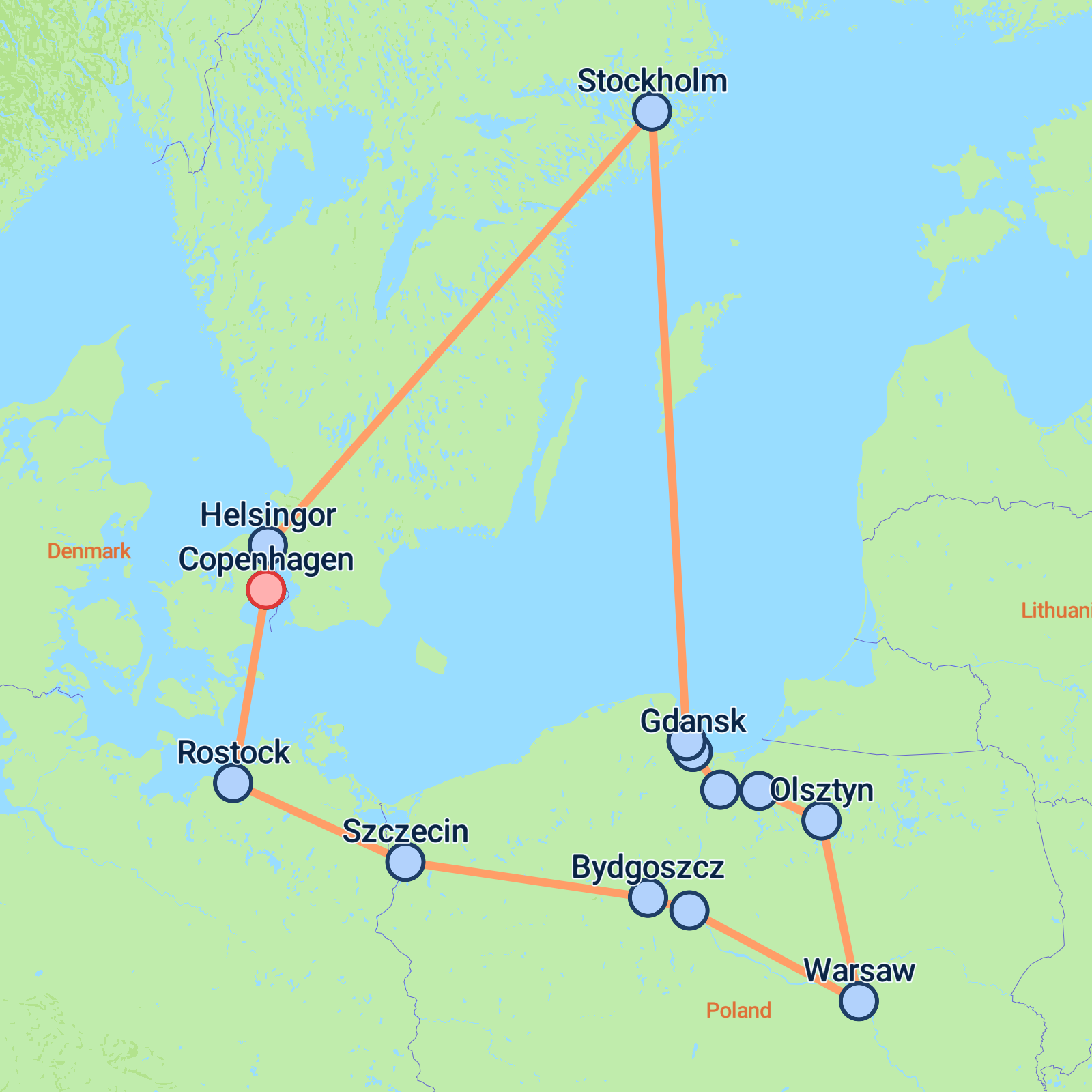 Embark on an 11-day adventure starting and concluding in the vibrant city of Copenhagen. This captivating journey takes you from Denmark through Germany, Poland, and Sweden, offering a blend of history, architecture, and nature. Discover the coastal city of Rostock and the historic charm of Szczecin. Wander the medieval streets of Toru? and experience Warsaws rich cultural tapestry. Explore the Elblag Canal and the imposing Teutonic Malbork Castle. In Gda?sk, delve into pivotal historical moments and then relax in the seaside resort of Sopot. Conclude in Stockholm, where you'll explore its stunning archipelago. This tour beautifully melds relaxation with cultural enrichment.
