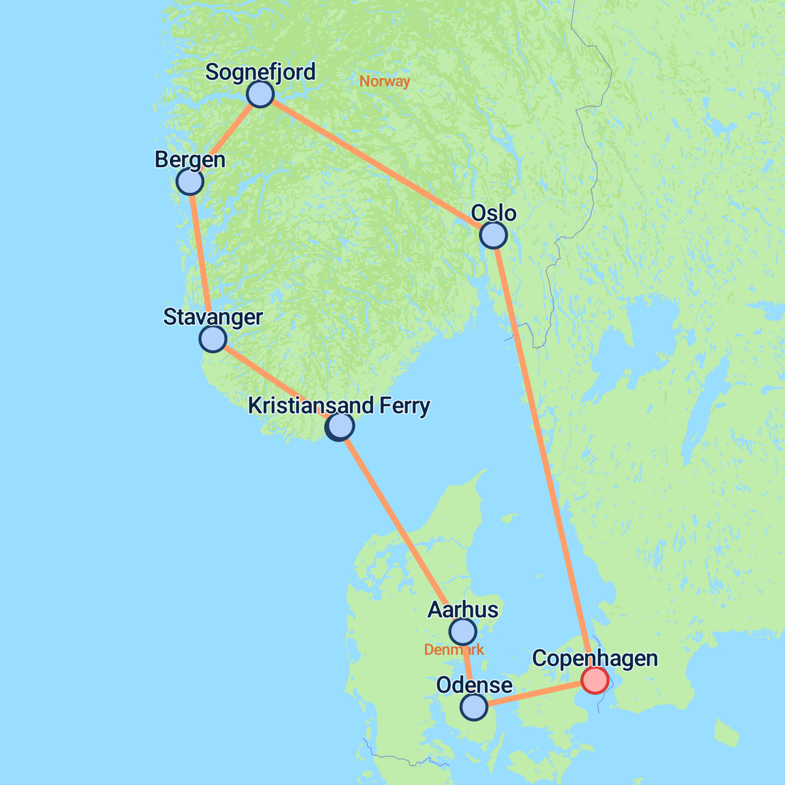 Embark on an eight-day adventure beginning and ending in Copenhagen, where youll explore Denmark and southern Norway's stunning landscapes and cities. Start by soaking up the vibrant atmosphere of Copenhagen, from the bustling Nyhavn to the legendary Little Mermaid. Sail from Aarhus to Norway, discovering picturesque towns like Flekkefjord and Stavanger. Marvel at Bergen's panoramic fjord views and cruise on the majestic Sognefjord. Wander through Oslos lively streets and Frogner Park's artwork before returning by ferry for a final taste of Copenhagen. Expect scenic routes, cultural landmarks, and the allure of Scandinavian coastlines throughout this enriching journey.