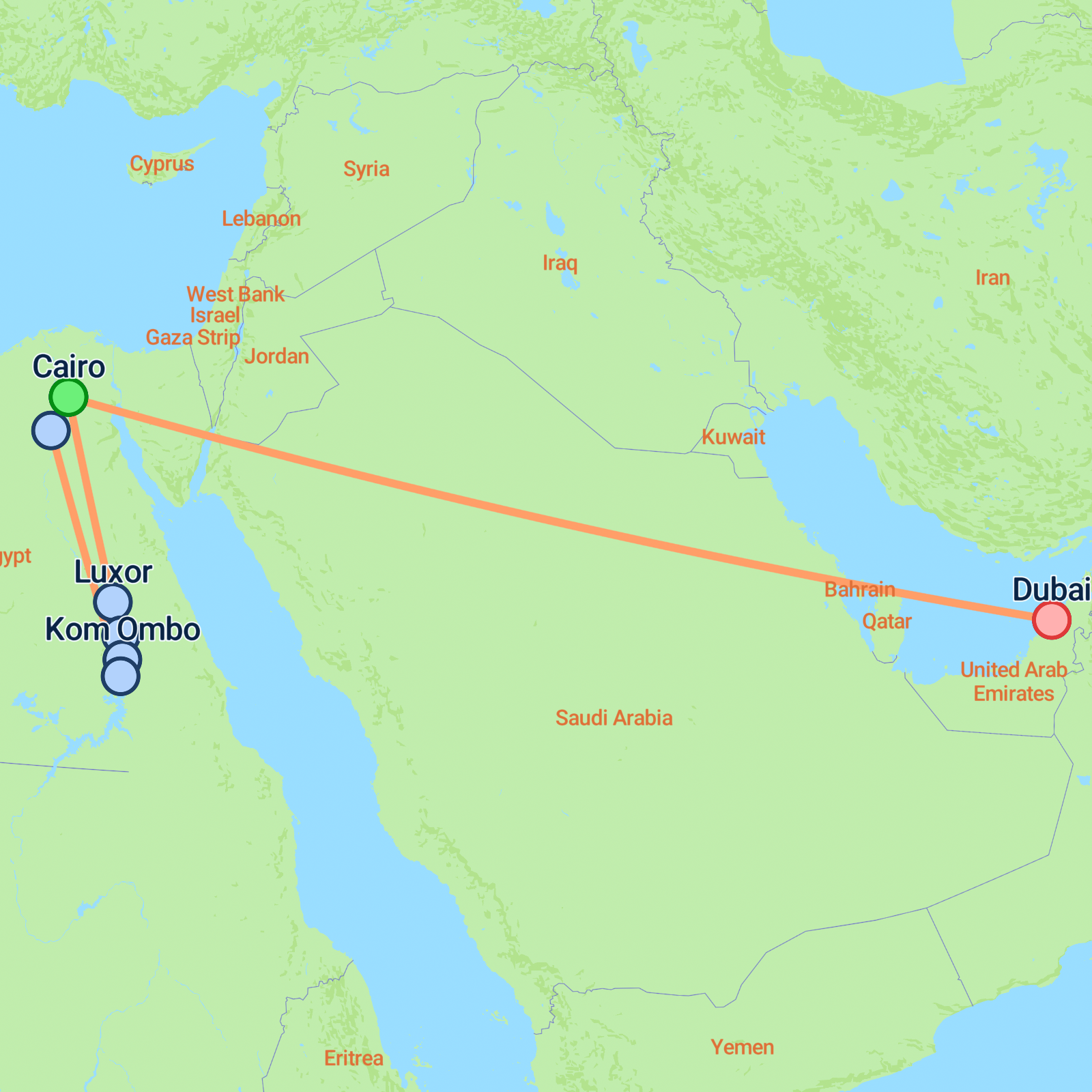 Cairo - Dubai. Today you will be transferred to Cairo Airport for your flight to Dubai. On arrival, you will be met and transferred to your hotel.