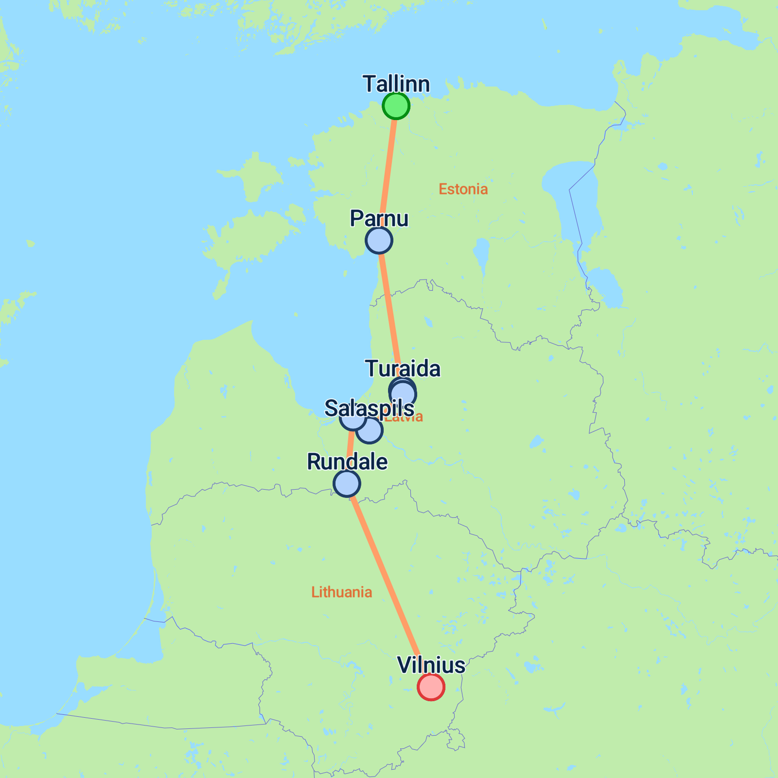 Set off on an unforgettable 7-day adventure beginning in Tallinn and concluding in Vilnius. Explore the charming medieval heart of Tallinn with its enchanting streets and iconic churches. Journey through the picturesque landscapes to Parnus delightful seaside, and immerse yourself in the historic allure of Turaida Castle. Discover Riga's vibrant culture and stunning Art Nouveau architecture. In Lithuania, marvel at the Baroque splendour of Rundale Palace and be captivated by the haunting beauty of the Hill of Crosses. Round off your trip with a visit to the enchanting Trakai Castle before delving into the fascinating history and architecture of Vilnius.