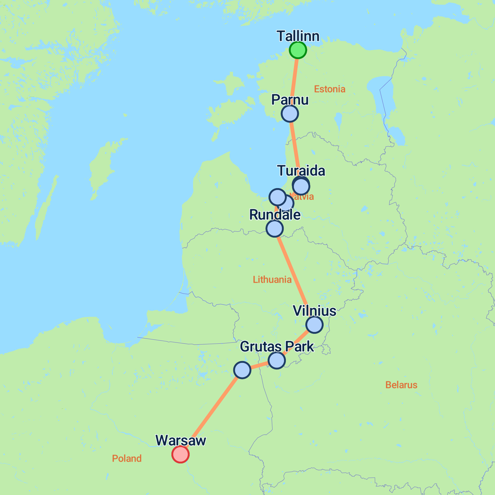 Embark on a captivating 9-day journey from Tallinn and conclude in the vibrant city of Warsaw. Explore Tallinns enchanting medieval core, wander through Parnus seaside charm, and marvel at the historic Turaida Castle. In Riga, discover its rich history and stunning Art Nouveau architecture. As you travel into Lithuania, be wowed by the Baroque splendour of Rundale Palace and the mystical Hill of Crosses. Vilnius will enchant you with its Baroque churches and historic medieval houses. In Poland, visit the fascinating Grutas Park and unwind in Augustw before arriving in Warsaw a city brimming with history and culture. Expect to be dazzled by its beautifully restored old town and lively atmosphere.
