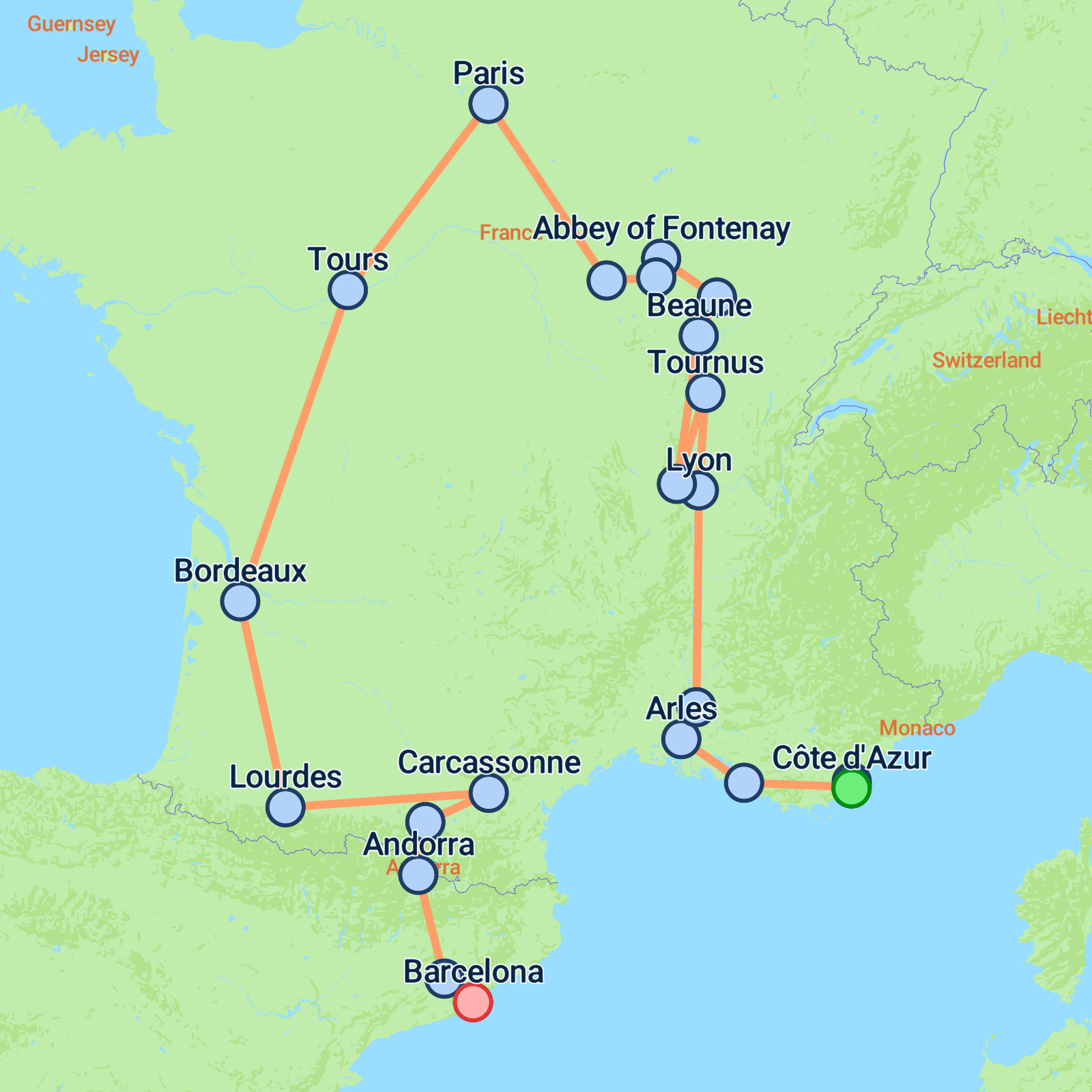 This 12-day adventure begins in the stunning Cte d'Azur and ends in the vibrant city of Barcelona. Expect to explore the luxurious Saint-Tropez, the historic charms of Marseille, and the artistic legacy of Arles, coupled with an enthralling visit to the Carrires de Lumires show. You'll find medieval wonders in Tournus and the remarkable halls of Savigny Castle, and marvel at Fontenay Abbey's architecture in Burgundy. Discover Paris's iconic sights and embark on a serene Seine cruise before venturing south through Bordeaux to Lourdes. Journey through the Pyrenees, discover Andorra's hidden gems, and soak up Barcelona's modernist marvels and vibrant atmosphere.