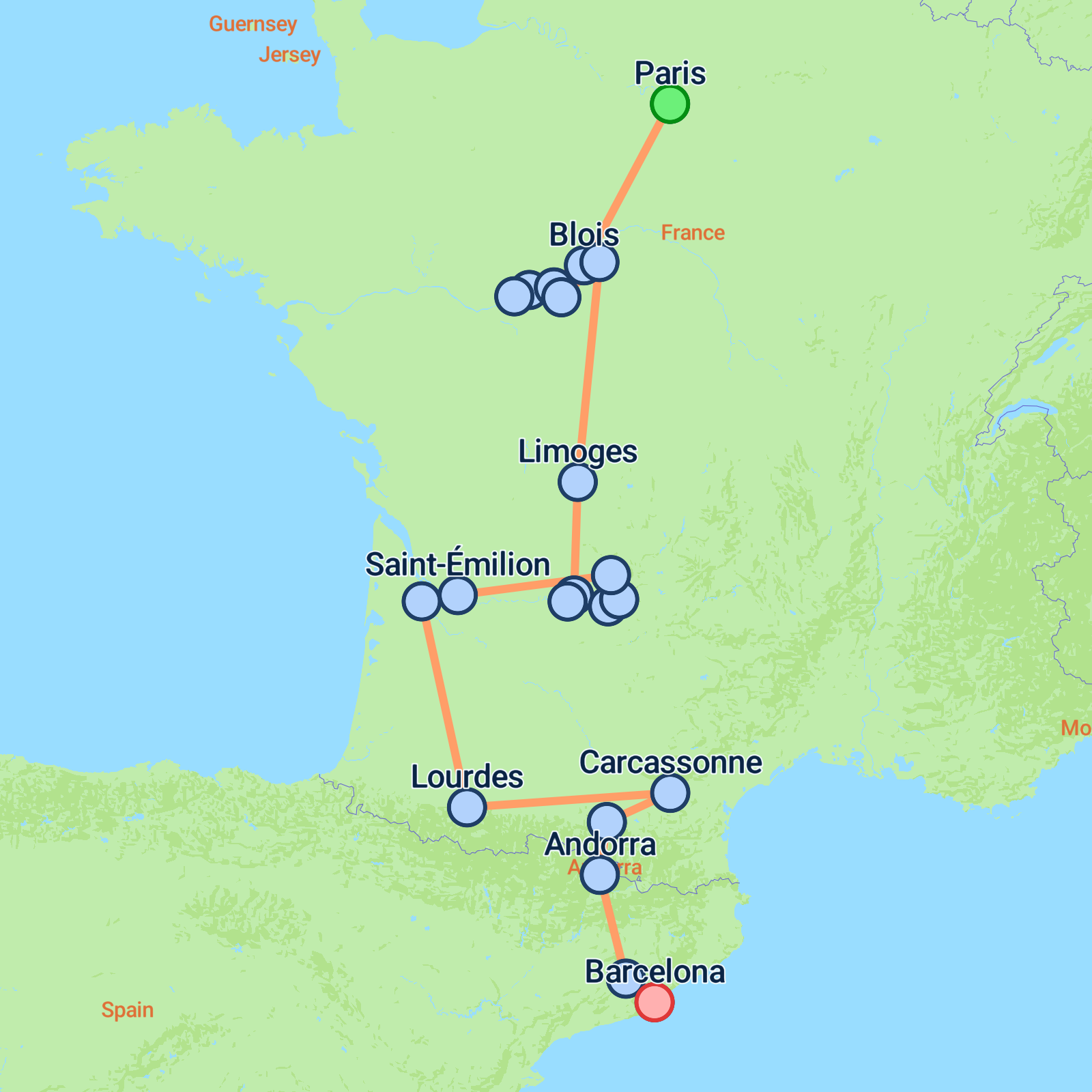 Embark on a captivating 9-day journey from Paris to Barcelona, full of iconic landmarks and charming towns. The adventure begins by uncovering the romantic allure of the Loire Valley before wandering through the picturesque villages of the Dordogne. Expect to explore stunning chteaux, delightful gardens, and quaint medieval streets. En route, the vibrant wine city of Bordeaux and the spiritual haven of Lourdes will captivate you. Traverse the snowcapped Pyrenees and soak up the charm of Andorras bustling capital. In Barcelona, immerse yourself in Gauds masterpieces and the lively Ramblas. Each day reveals new experiences and unforgettable memories.