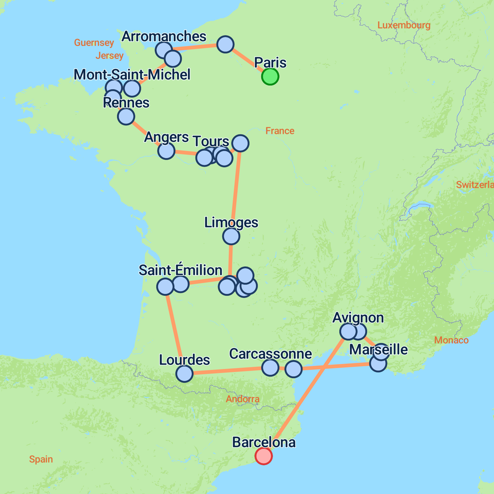 Set off from the vibrant city of Paris on an 11-day journey that concludes in the lively streets of Barcelona. Immerse yourself in the charm of Normandy with visits to Monets house in Giverny and the historic WW2 beaches of Arromanches. Experience the wonder of Mont-Saint-Michel and the enchanting walled city of Saint-Malo. Wander through breathtaking Loire Valley castles like Chteau de Chenonceau and see marvellous medieval towns such as Sarlat. Enjoy the historic beauty of Bordeaux and the spiritual serenity of Lourdes. Your adventure through Frances diverse landscape wraps up with the sunlit splendour of Provence. A memorable tour awaits.