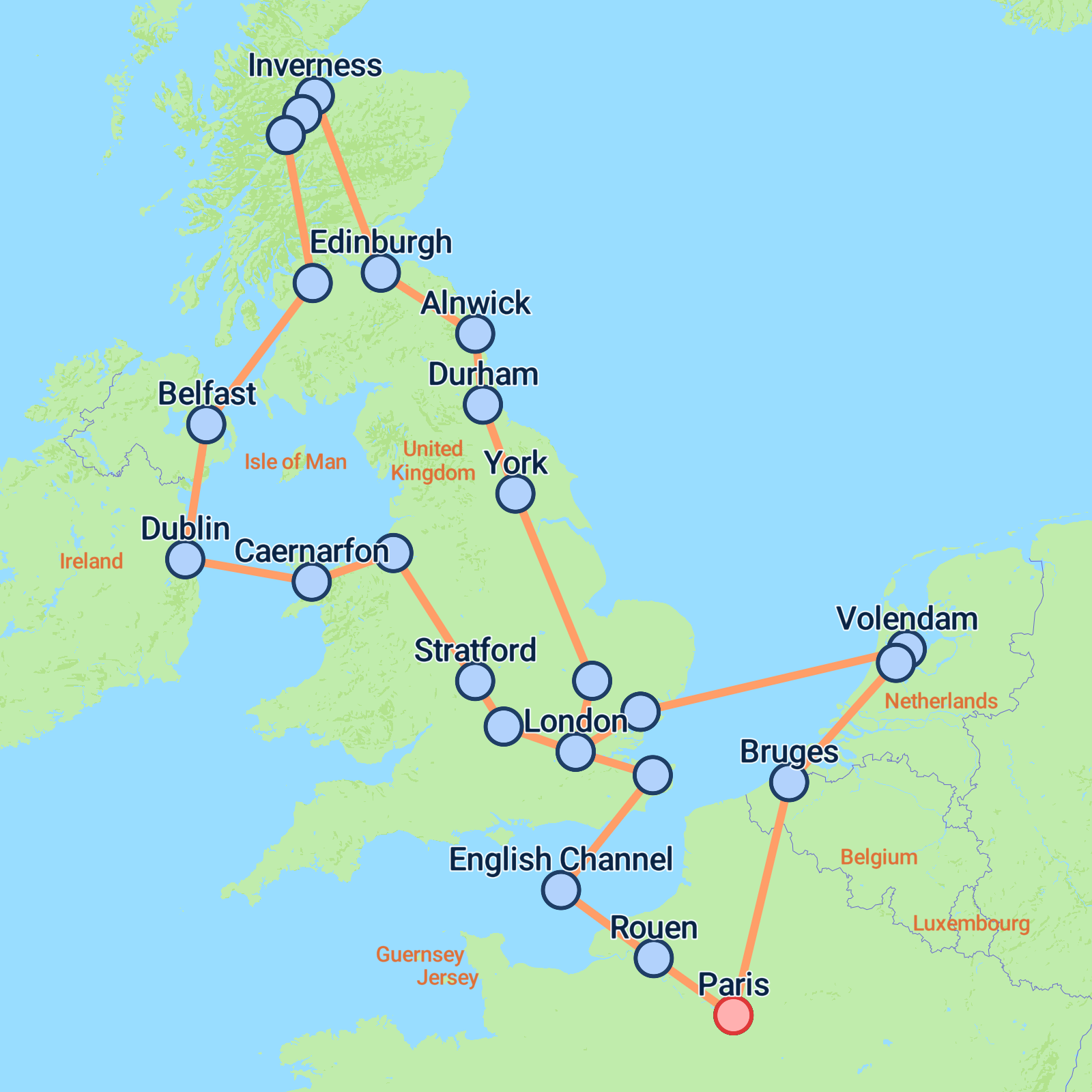 Embark on a captivating 16-day adventure, starting and ending in the romantic city of Paris. Immerse yourself in the wonders of France, England, Scotland, Ireland, Wales, and the Netherlands. Highlights include the iconic Eiffel Tower, the historical splendour of Rouen, Canterbury, and York, and a scenic ferry ride across the English Channel. Experience the magical architecture of Edinburgh and the Highlands mystique before venturing through bustling Glasgow and Belfast. Savour Dublins charm, Liverpools musical heritage, and the scholastic beauty of Oxford. Conclude with vibrant Amsterdam and the medieval allure of Bruges before returning to Paris. This journey promises an unforgettable blend of history, culture, and breathtaking landscapes.