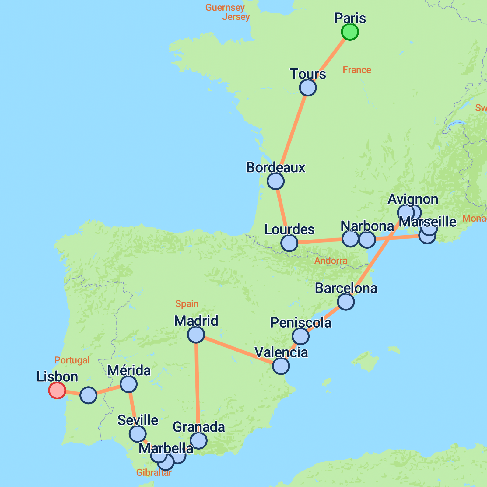 Embark on an unforgettable 15-day adventure starting in Paris and culminating in the charming city of Lisbon. Begin by exploring Paris, with highlights like the iconic Eiffel Tower and the bohemian charm of Montmartre. Journey through the vineyards to Bordeaux before discovering the spiritual allure of Lourdes. Traverse the sun-kissed regions of Carcassonne and Provence, then dive into Barcelona's vibrant culture. As you move into Spain, wander through Valencia and the historical streets of Madrid. Marvel at the Alhambra in Granada and meander along the Costa del Sol with stops in Malaga and Marbella. Finish with Seville's flamenco vibrancy before soaking up Lisbon's rich history and scenic beauty.