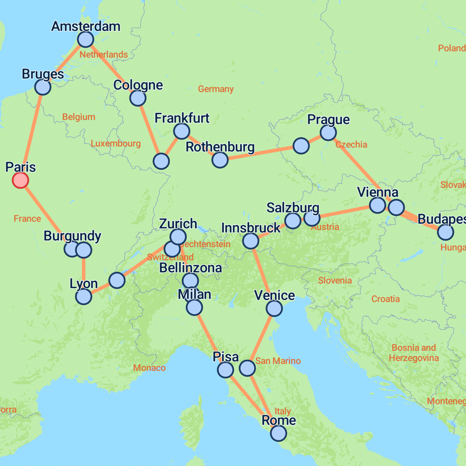 Embark on an unforgettable 23-day adventure starting and ending in the magical city of Paris. This comprehensive tour takes you through the iconic landmarks and hidden gems of Europe. In France, marvel at the grandeur of the Palace of Versailles and the charm of Lyon. Journey through the Swiss landscapes from Geneva to Zurich, and experience the breathtaking scenery of Lucerne. Italy awaits with the Leaning Tower of Pisa and the captivating canals of Venice. Continue to Austria's Salzburg and Vienna, then explore Hungary's vibrant Budapest. Conclude with the charm of Amsterdam and the medieval allure of Bruges. From historic cities and stunning panoramas to culinary delights, this tour is a European dream come true.