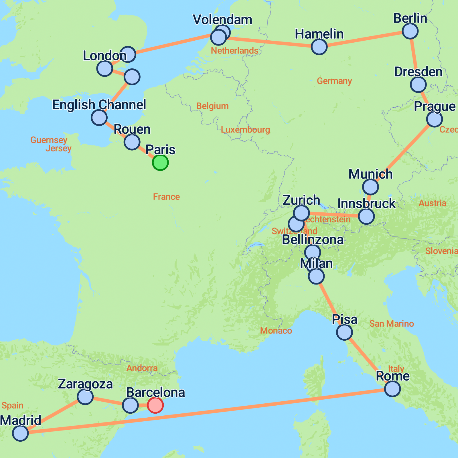 Embark on a captivating 22-day adventure starting in the enchanting city of Paris and ending in bustling Barcelona. Dive into French elegance at the Palace of Versailles, and charm in Paris' Montmartre. Witness the timeless allure of London's iconic landmarks and soak up the artistic vibe of Amsterdam and the historic allure of Berlin. Travel through the fairy-tale streets of Prague and the scenic splendour of the Alps, relishing the cultural richness of Rome, before catching the buzz of vibrant Madrid. Expect to see UNESCO World Heritage Sites, breathtaking landscapes, and iconic architecture. Finish off in Barcelona, immersed in Gaudi's artistic genius and the Mediterranean charm. This tour promises an unforgettable mix of history, culture, and stunning scenery.