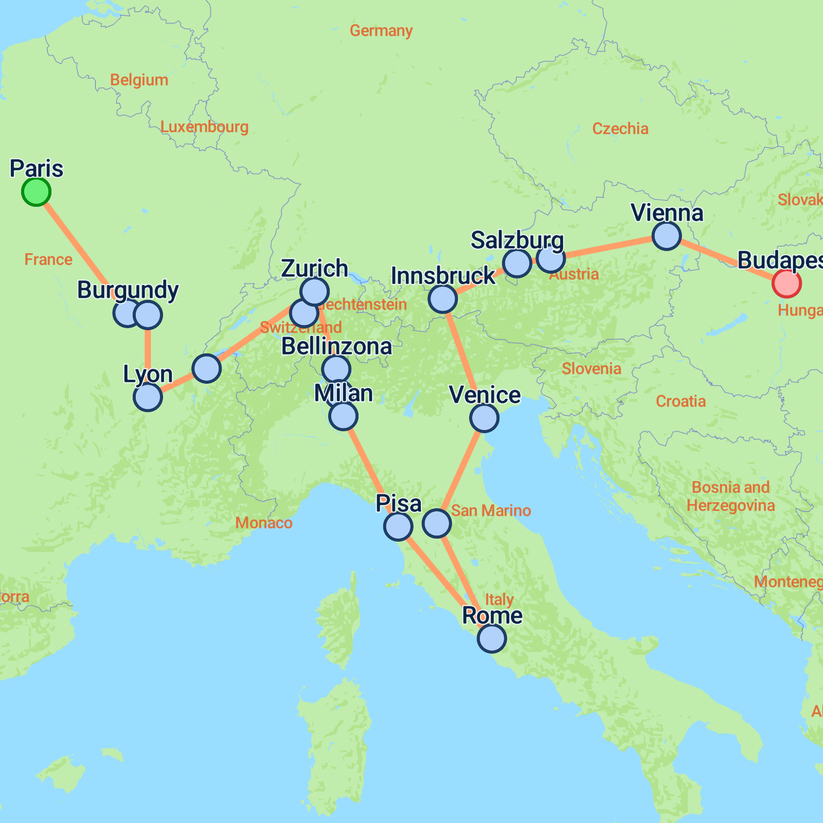 Embark on a 17-day adventure from the romantic streets of Paris to the stunning banks of the Danube in Budapest. Beginning in the City of Light, explore the grandeur of Versailles and the bohemian charm of Montmartre. Venture into Frances heart with stops in Burgundy and Lyon, before soaking up Switzerlands pristine beauty around Zurich and Lucerne. Cross into Italy to marvel at the Leaning Tower of Pisa and the Renaissance wonders of Florence. Glide through Venices canals and savour Austrias alpine allure in Salzburg. Conclude in Vienna and Budapest expect vibrant culture, breathtaking vistas, and unforgettable experiences at every turn.