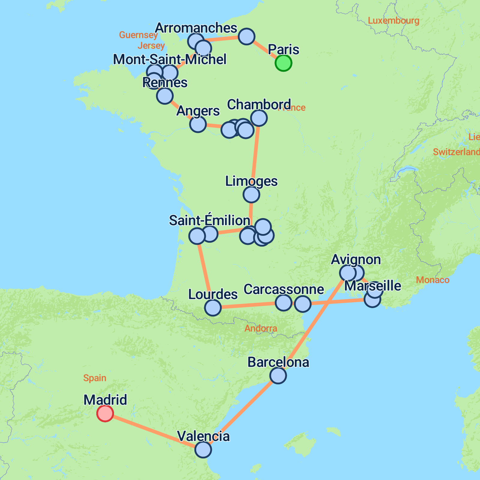 Launching from Paris, this 13-day adventure whisks you off through some of France and Spain's most alluring sites, wrapping things up in the vibrant city of Madrid. Expect the likes of Monet's exquisite gardens, the historical depths of Normandys D-Day beaches, and the mesmerising Mont-Saint-Michel. Wander tranquil Breton villages and the rich landscapes of the Loire Valley, sprinkled with iconic chteaux. From the elegant streets of Bordeaux to the spiritual aura of Lourdes, each day offers a new tapestry of experiences. As you cross into Spain, delight in the artistry of Barcelona and the flavours of Valencia before Madrid charms you with its majestic avenues and lively squares.