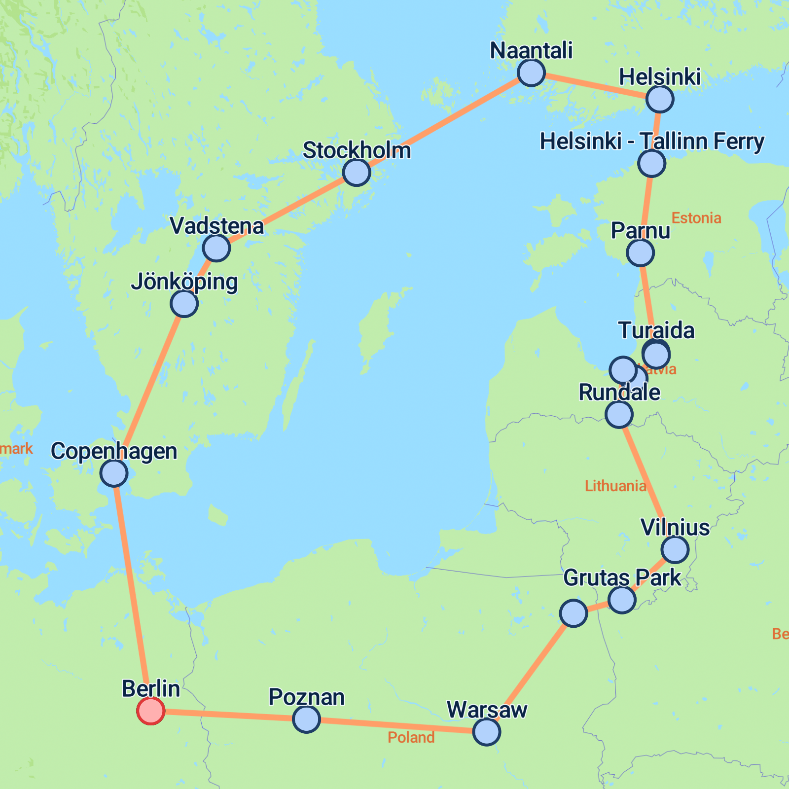Kick off your 18-day journey in the vibrant and historic city of Berlin, exploring its cultural treasures like the Brandenburg Gate and the Berlin Wall Memorial. Your adventure will whisk you away through the scenic landscapes of northern Europe from the canals and colourful charm of Copenhagen to the fairy-tale hamlet of Kronborg Castle in Elsinore. In Sweden, soak up the beauty of Stockholm's island cityscape before embarking on an overnight ferry to Finland. Traverse the Baltic region, marvelling at Finland's land Islands, Estonia's medieval wonder of Tallinn, and the grandeur of Latvia's Riga. The journey concludes in Warsaw, Poland, after a captivating ride through Lithuanias Hill of Crosses and the baroque beauty of Vilnius. Your grand loop circles back to Berlin, promising endless memories and enchanting experiences.