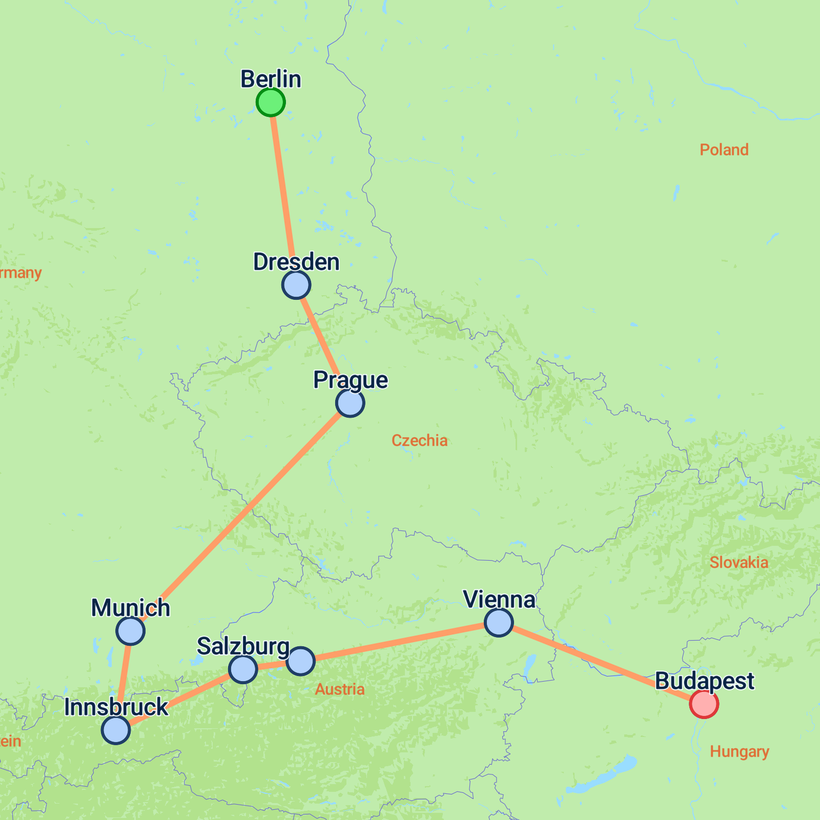 Embark on this 10-day adventure starting in the vibrant streets of Berlin and concluding in the historic beauty of Budapest. Kick off by delving into Berlins modern and historical sites, then travel through Germanys Dresden to marvel at its architectural splendour. Venture onward to Prague, where you'll explore the majestic castle and take a scenic boat ride. Your journey continues through Munichs charm to the Alpine wonders of Innsbruck and Kitzbhel. Discover Salzburg, renowned as Mozart's city, before cruising on Lake Traunsee and reaching the imperial elegance of Vienna. Enjoy Budapest's stunning views along the Danube. An unforgettable European escape awaits you.