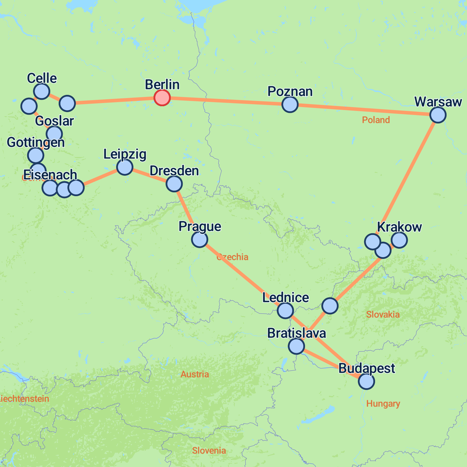 Embark on a 14-day adventure from Berlin to Berlin, exploring the heart of Central Europe! Your journey kicks off in Berlin, where you'll dive into history with visits to iconic landmarks like the Brandenburg Gate and the Berlin Wall Memorial. Discover Germany's automotive heritage in Wolfsburg and marvel at the picturesque charm of Celle's half-timbered houses. In Goslar, explore UNESCO World Heritage Sites and relish the enchanting medieval atmosphere. Enjoy the vibrant cultural scene in Leipzig and soak in the grandeur of Dresden. Cross into the Czech Republic to discover Prague's magical charm before winding through Slovakia, Hungary, and Poland. End your unforgettable tour back in Berlin.