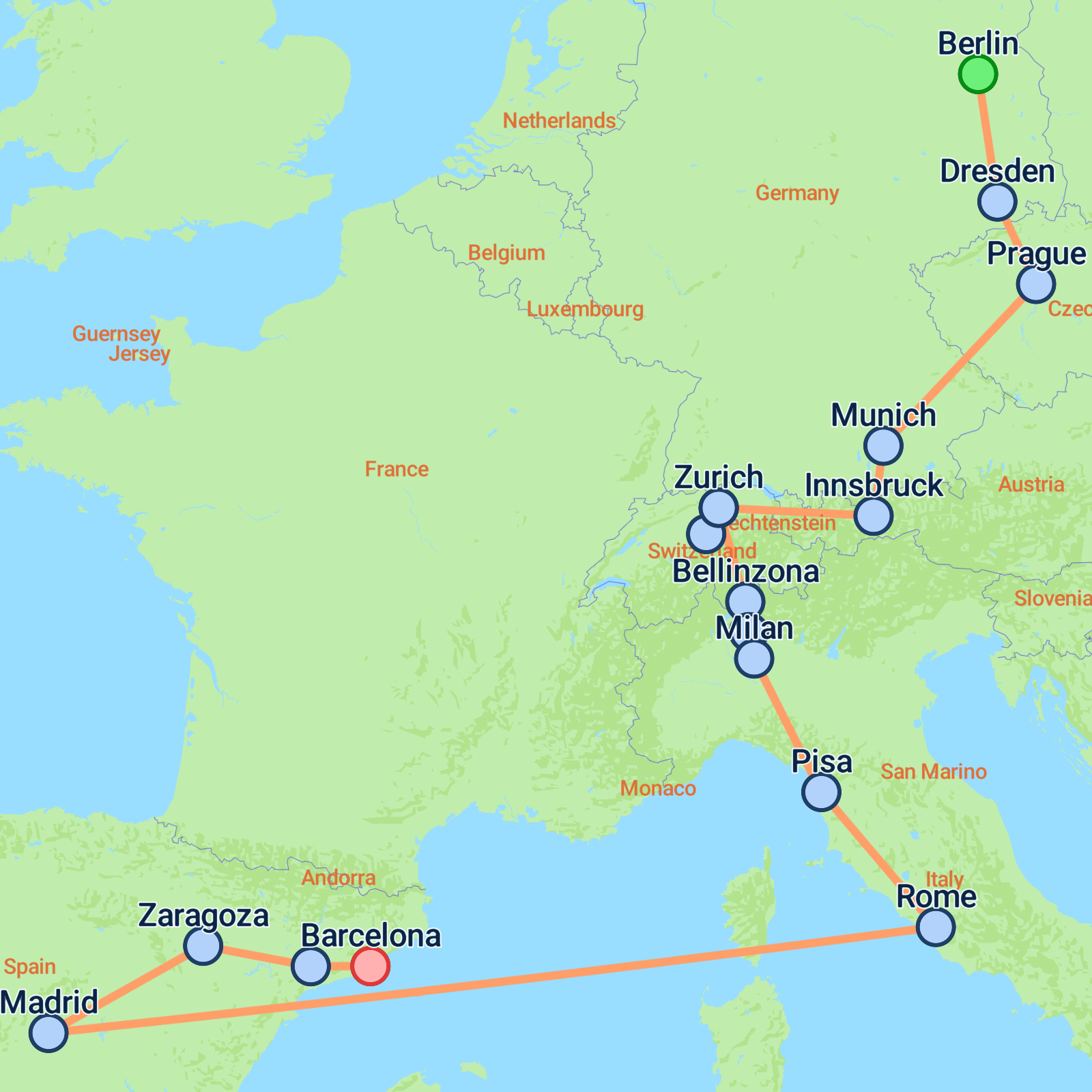 Starting your adventure in Berlin and wrapping up in the vibrant city of Barcelona, this 15-day tour offers an enticing journey through some of Europes most captivating destinations. From the historic wonders of Berlin and Dresden to the charming streets of Prague, youll soak up a blend of culture, history, and stunning architecture. Experience the alpine beauty of Innsbruck and the lakeside allure of Lucerne. Then, traverse Italys breathtaking landscapes, exploring Como, the iconic Leaning Tower of Pisa, and the Eternal City, Rome. As you travel to Spain, uncover Madrids charms before concluding your unforgettable trip in enchanting Barcelona.