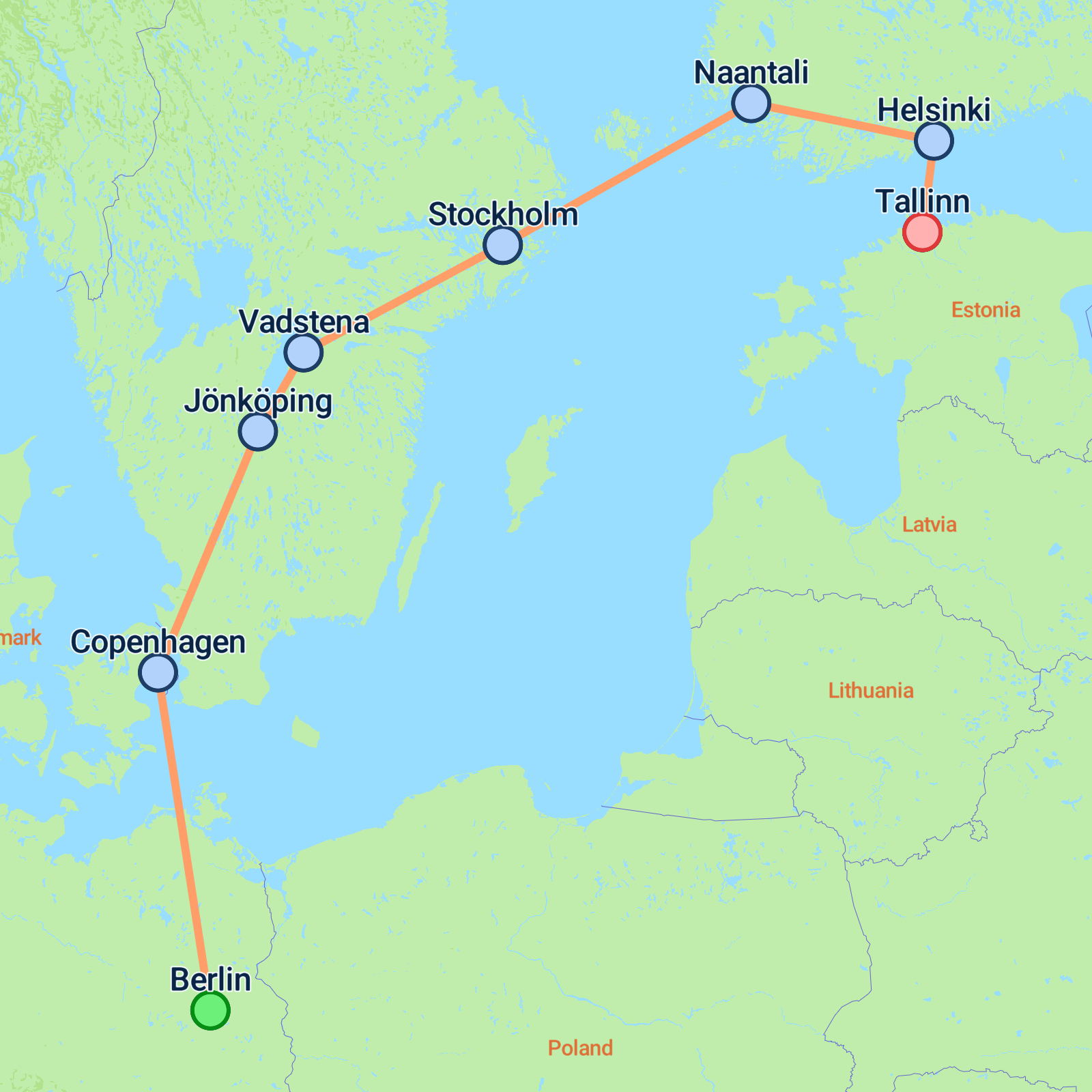Kick off your 11-day adventure in the vibrant city of Berlin and conclude in the medieval charm of Tallinn. Begin by exploring Berlin's historic heart from the Brandenburg Gate to the fascinating Berlin Wall Memorial. Journey north with a scenic ferry crossing to Copenhagen, where you'll discover the allure of Danish culture and architecture. Continue into Sweden, taking in the tranquil beauty of Jnkping's lakes and Vadstena's castle before wandering Stockholm's cobbled streets. Sail overnight to Finland, where Helsinki's unique architecture awaits. Your voyage ends in Tallinn, with its beautifully preserved medieval sites. Expect captivating landscapes, rich history, and unforgettable cultural experiences.