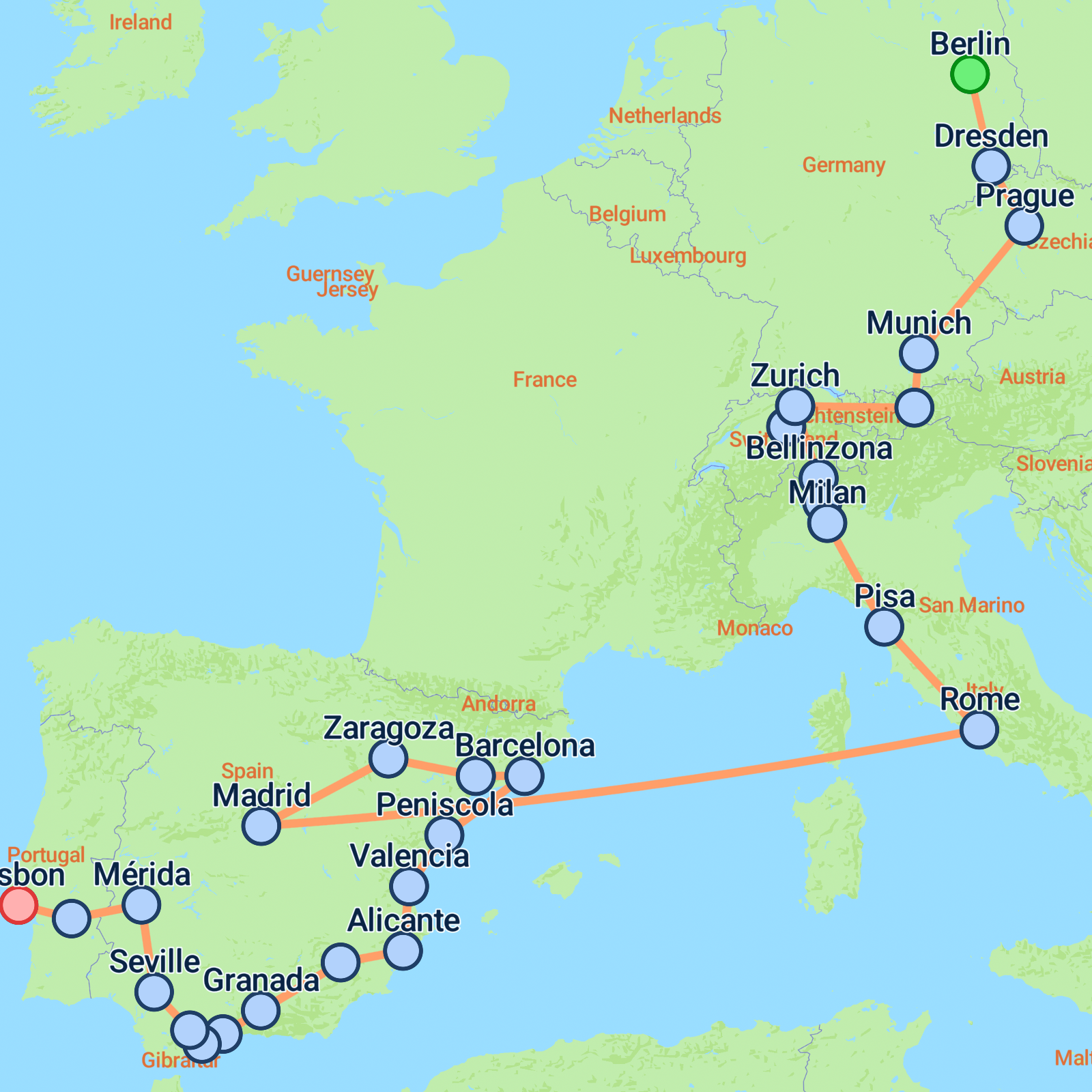 Begin your 22-day adventure in the vibrant city of Berlin, soaking up its fascinating history with visits to the Brandenburg Gate and the Berlin Wall Memorial. Journey through Germany's scenic landscapes to cultural Dresden before heading to captivating Prague, where you'll explore the iconic Castle and cruise the Vltava River. Discover Munich, wander the charming streets of Innsbruck, and marvel at Swarovski crystals before arriving in Zurich. Experience Swiss beauty in Interlaken and Lucerne, then cross the Alps to Italy, visiting Milan, Como, and the Leaning Tower of Pisa. Stroll through historic Rome and lively Trastevere. In Spain, wander Madrid's iconic spots and explore Barcelona's artistic flair. Relax in Valencia with its rich history, then embrace the Andalusian spirit in Granada and Seville. Your journey concludes in Lisbon, Portugal, exploring its majestic hills and charming alleys.