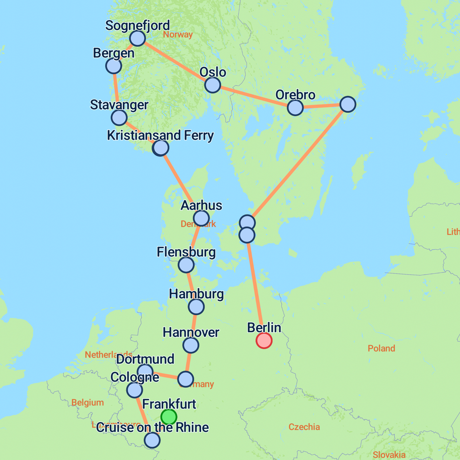 Embark on an unforgettable 13-day journey from Frankfurt to Berlin, where you'll traverse a captivating landscape rich in history and natural beauty. Immerse yourself in Germany's fairy-tale villages and meander along the picturesque Rhine and Moselle Valleys with a scenic cruise. Experience the grandeur of Cologne's Gothic cathedral and explore the magical towns of the Brothers Grimm's Fairy Tale Route. In Scandinavia, cross the stunning North Sea by ferry, explore Norway's breathtaking fjords, and revel in the charm of Denmark's Aarhus. Conclude with cultural highlights in Stockholm, Copenhagen, and Berlin from Viking monuments to the Little Mermaid. Expect remarkable vistas and cultural treasures at every stop.