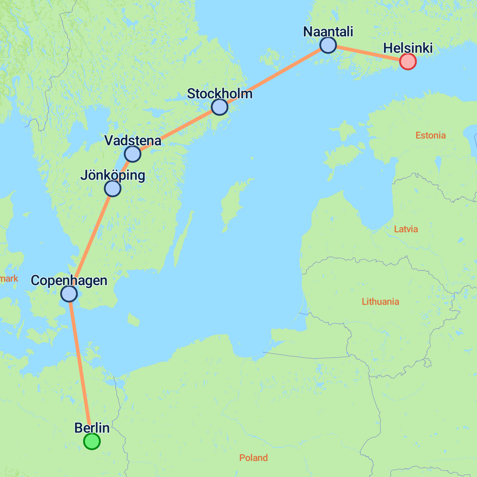 Begin your adventure in Berlin and conclude in Helsinki on this captivating 9-day tour. Immerse yourself in Berlin's vibrant culture, exploring iconic sites such as the Brandenburg Gate and the Berlin Wall Memorial. Cross the Baltic Sea to Copenhagen for a taste of Danish charm with highlights like The Little Mermaid and the colourful Nyhavn harbour. Journey into Sweden, visiting the majestic Kronborg Castle and the picturesque town of Vadstena, before arriving in Stockholm. Enjoy its historic Gamla Stan and panoramic vistas. Sail to Finland, experiencing Turku's allure and Helsinki's vibrant streets. Expect a blend of history, stunning landscapes and enriching cultural experiences throughout.