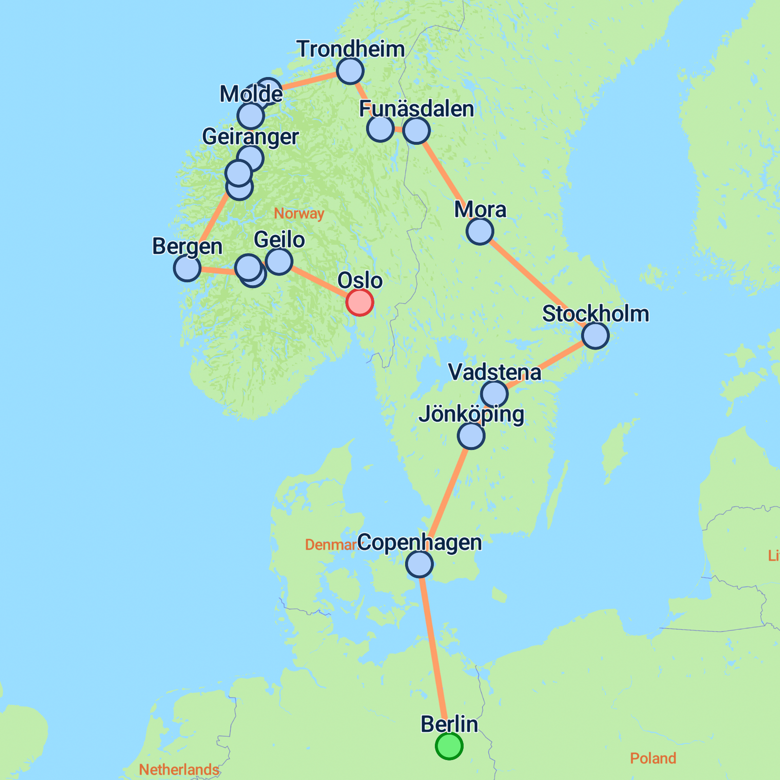 Embark on a captivating 13-day adventure from Berlin to Oslo, where diverse landscapes and rich history await. The journey kicks off with the vibrant energy of Berlin, exploring iconic sites such as the Brandenburg Gate and the Berlin Wall Memorial. Delight in a ferry crossing to Copenhagen and wander through its colourful Nyhavn harbour. Discover Swedens picturesque landscapes, from the charming town of Jnkping to Stockholm's historic Gamla Stan. As you continue to Norway, expect stunning fjords and the majestic Norwegian Sea. Highlights include the Atlantic Road and breathtaking Geiranger Fjord. Conclude in Oslo, experiencing its scenic beauty and cultural richness.