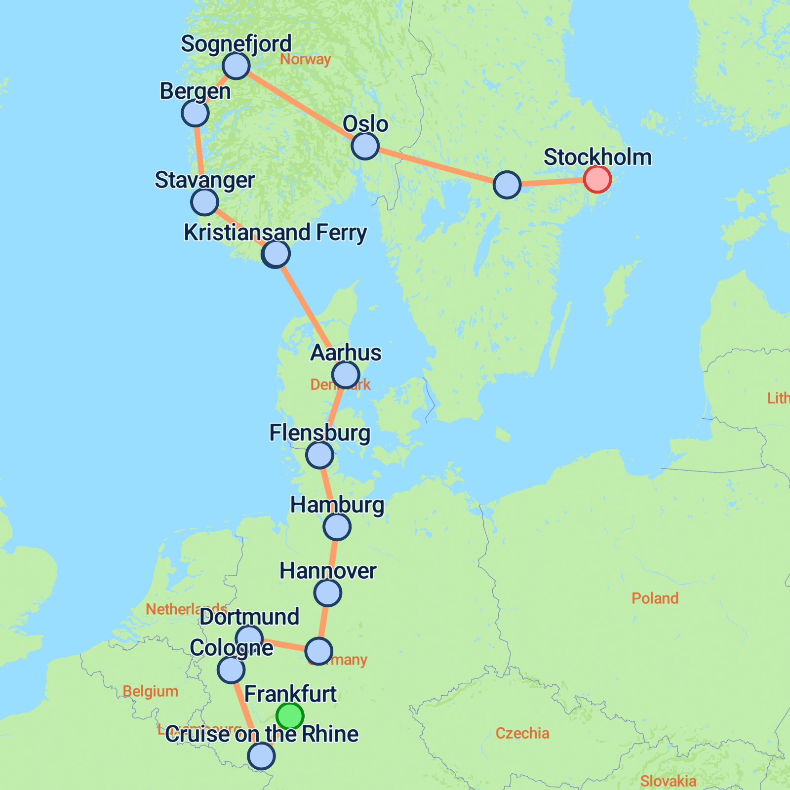 This 10-day tour kicks off in Frankfurt and wraps up in the stunning city of Stockholm, offering a captivating journey through Germany, Denmark, Norway, and Sweden. You'll explore the enchanting Rhine and Moselle Valleys with picturesque river cruises and stroll through Cologne's lively centre. Relive childhood tales on the Fairy Tale Route, and soak up the maritime charm in Hamburg. Journey across the North Sea to Norway, where you'll discover scenic coastal drives and the majestic fjords. In Oslo, immerse yourself in art and culture before heading to the vibrant cities of rebro and Stockholm. Expect breathtaking landscapes, rich history, and unforgettable moments.