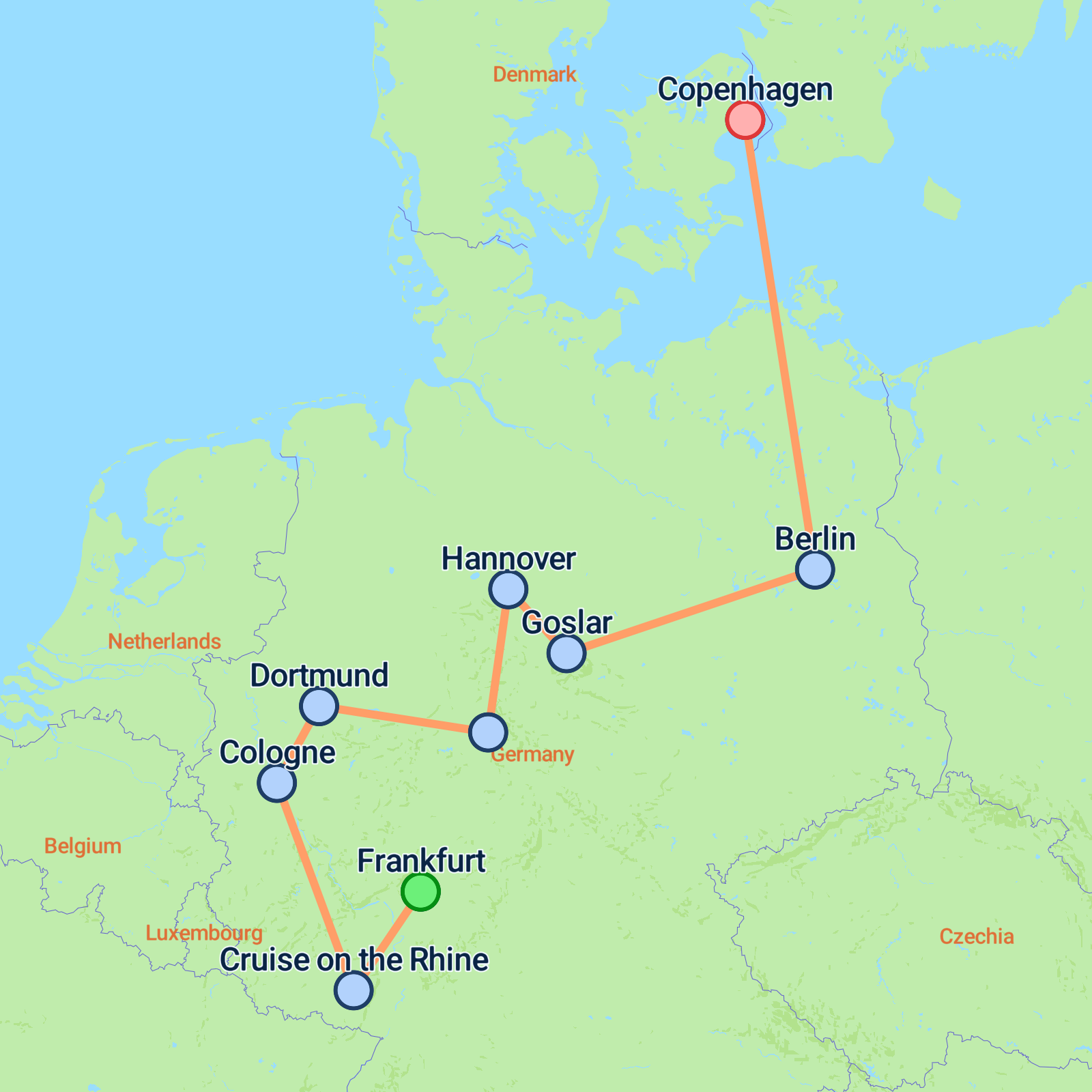 Embark on an enchanting eight-day adventure starting in Frankfurt and ending in Copenhagen. Discover the beauty and history of Germany and Denmark as you cruise along the scenic Rhine River, visit Cologne's towering Gothic cathedral, and explore fairy-tale villages along the Brothers Grimm's famed Fairy Tale Route. Marvel at Goslars wooden architecture, wander through Quedlinburgs UNESCO-listed streets, and enjoy a panoramic tour of Berlin, with its iconic Brandenburg Gate and Berlin Wall Memorial. Cross the Baltic Sea to vibrant Copenhagen, taking in sights like The Little Mermaid and Nyhavn harbour, wrapping up an unforgettable journey with unforgettable memories.
