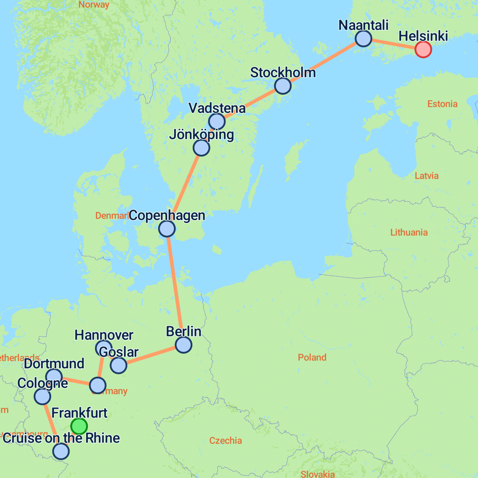Your 12-day adventure kicks off in Frankfurt and ends in vibrant Helsinki. Experience the scenic charm of Germany's Rhine and Moselle Valleys with a picturesque cruise, followed by an exploration of Cologne's Gothic cathedral. You'll travel along the enchanting Fairy Tale Route, discovering the stories behind the Brothers Grimm's tales and exploring towns like Hamelin. In Berlin, revel in the city's historic heart and modern flair. Cross the Baltic to Copenhagen, exploring Danish culture and lifestyle, before heading to Sweden, stopping in Stockholm's stunning archipelago. Don't miss the overnight ferry to Finland, where you'll navigate between myriad islands, concluding with Helsinki's unique blend of Scandinavian and Russian culture.