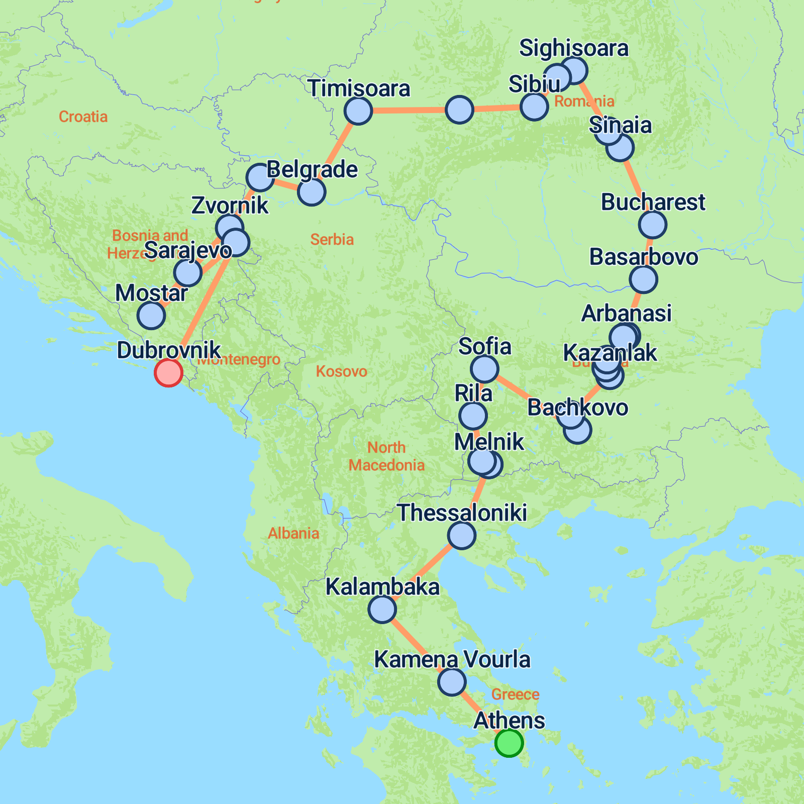 Embark on a 15-day adventure from Athens to Dubrovnik, exploring the heart of the Balkans and beyond. Start in Athens with its storied Acropolis and lively Plaka district, then journey to northern Greece's Meteora for stunning views and historic monasteries. In Bulgaria, marvel at Rila Monastery and enjoy Plovdiv's ancient charm. Discover Romania's Dracula-centric legends at Bran Fortress and admire Sibiu's cultural vibrancy. Journey through Serbias lively Belgrade, delve into Bosnias rich history in Sarajevo and Mostar, and conclude in the breathtaking beauty of Dubrovnik, with its cliffside views and medieval wonders. Expect a trip filled with cultural revelations, dramatic landscapes, and warm hospitality.