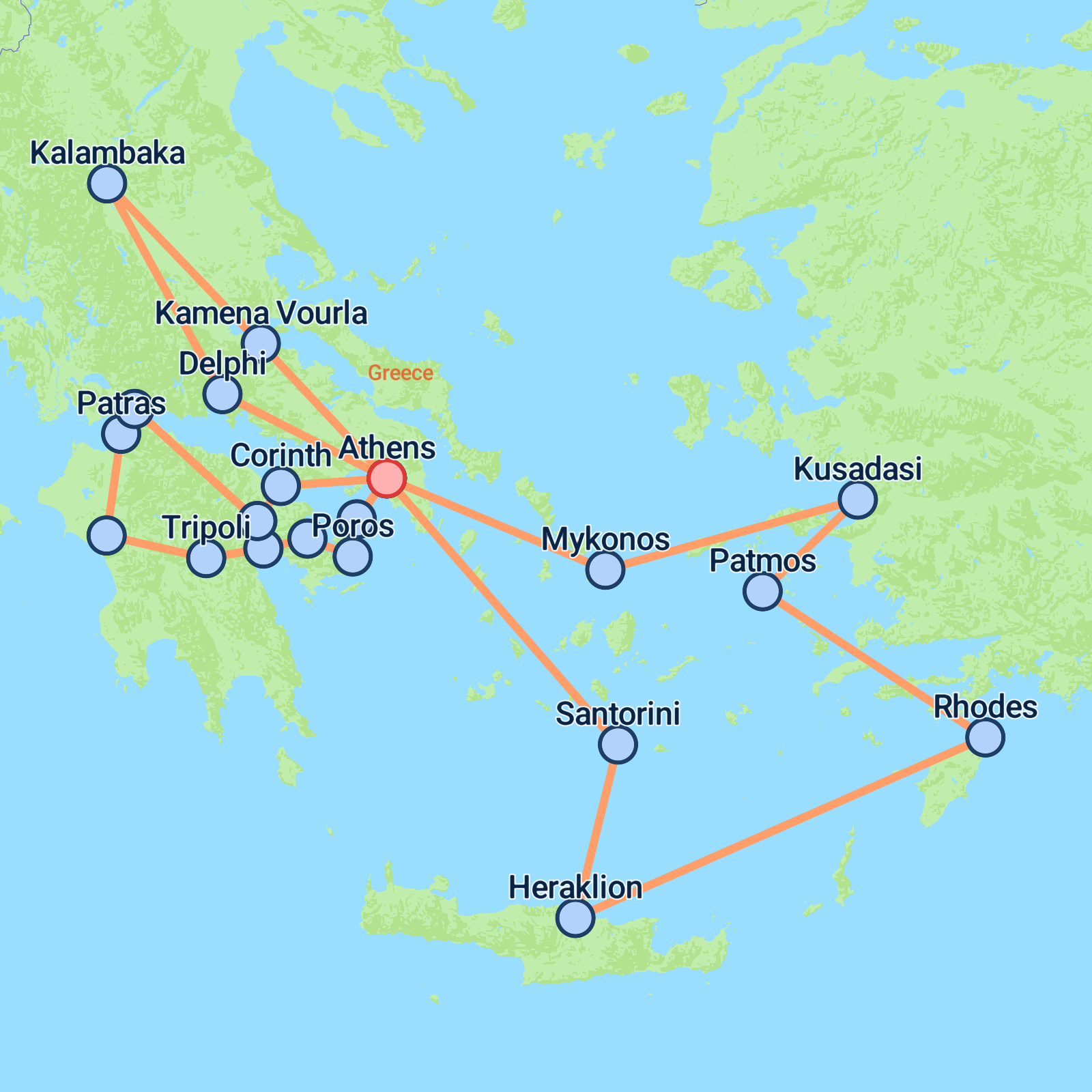 Embark on a 13-day adventure starting and ending in Athens, exploring the wonders of Greece and its neighbouring treasures. Begin by discovering Athens's iconic sites, then venture north to the picturesque Meteora with its stunning monasteries. Journey through ancient Delphi and explore the celebrated Byzantine Monastery of Hosios Loukas. Delve into Greek island life with visits to Aegina, Poros, and the charming town of Nafplio. Marvel at the ancient ruins of Olympia and the citadel of Mycenae. Enjoy a Mediterranean cruise stopping at Mykonos, Kusadasi, and the striking island of Santorini. Expect breathtaking scenery, rich history, and unforgettable cultural experiences.