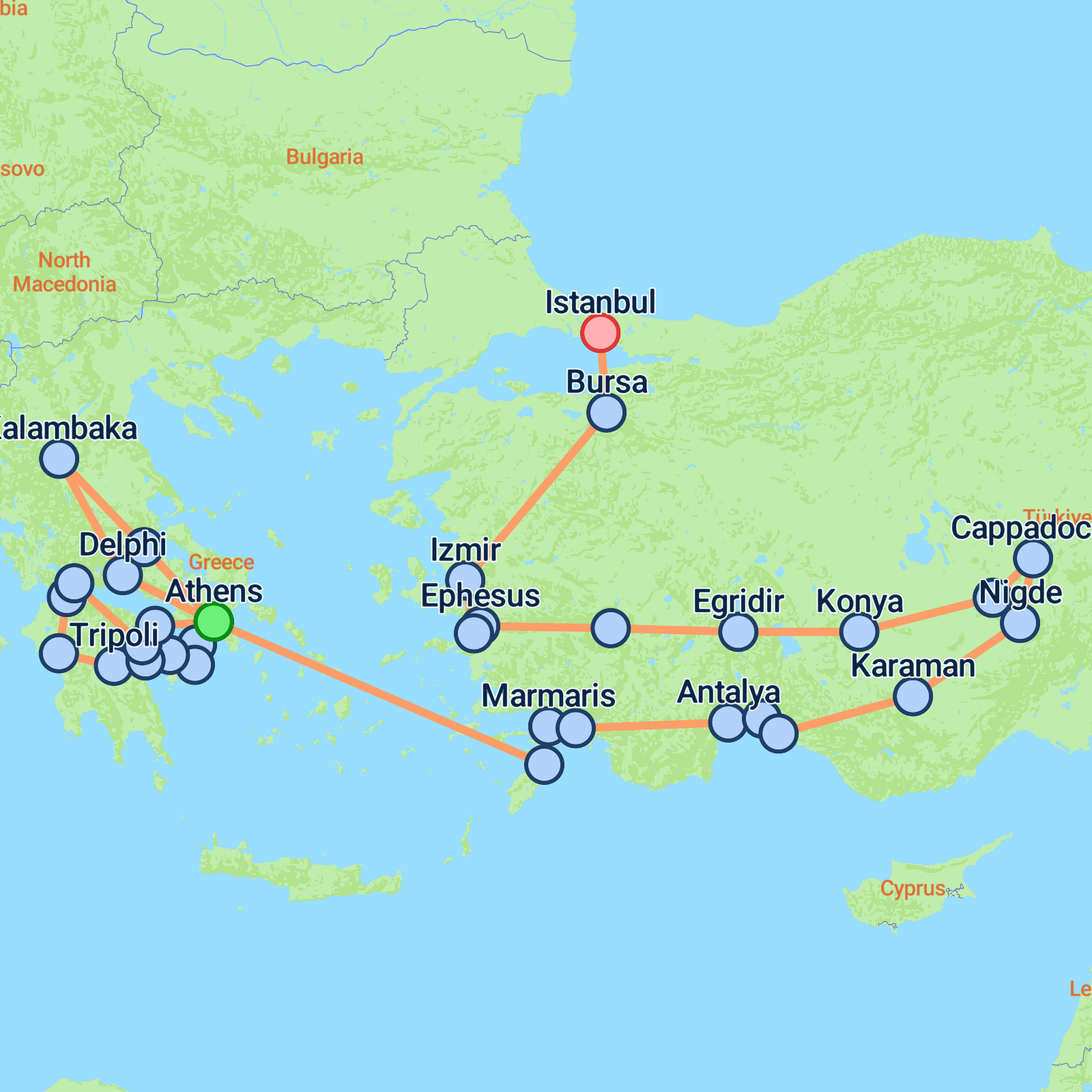 Kick off your 19-day adventure in Athens, exploring its historic charm and iconic sites before journeying north to Kalambaka and the magnificent Meteora Monasteries. Traverse Greece's stunning landscapes, visiting Delphis archaeological wonders and the scenic Saronic Islands, before heading to Nafplio, home to Venetian fortresses. Once in Turkey, discover the rhythm of bustling cities from Marmaris to Antalya, including delightful boat rides and ancient ruins such as Ephesus. Finally, arrive in Istanbul to explore its vibrant markets, stunning mosques, and palatial architecture. This tour is the perfect blend of culture, history, and breathtaking scenery.