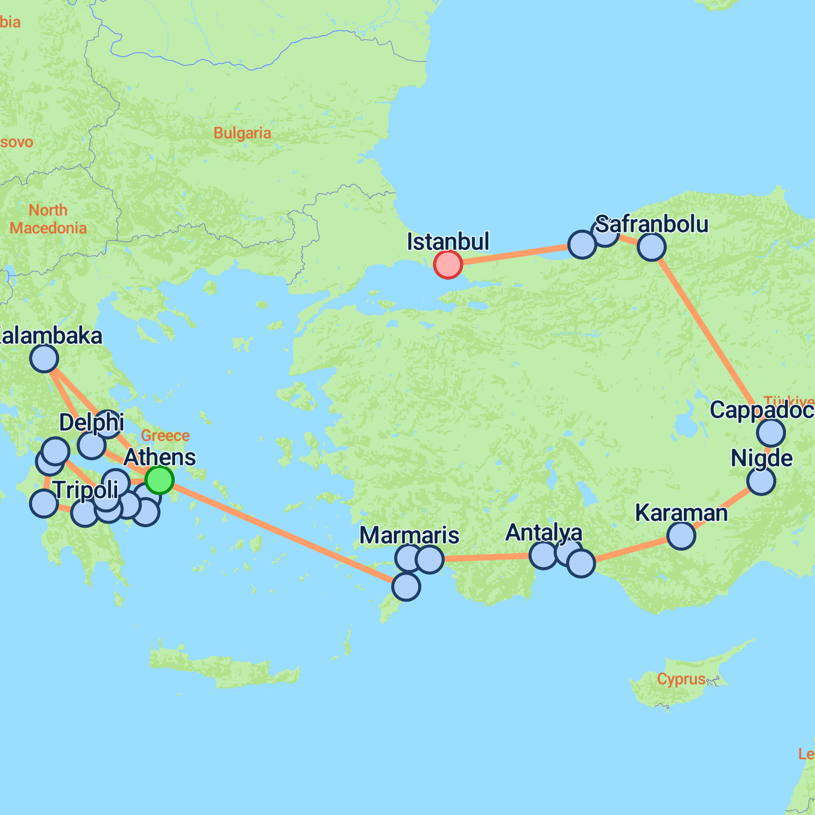 Begin your epic 17-day journey in Athens, taking in the vibrant culture and historic landmarks. Marvel at the Meteora's stunning monasteries and the archaeological wonder of Delphi before a scenic Greek island-hopping excursion to Aegina and Poros. Cross into Turkey and explore Marmaris picturesque harbour, the treasures of Antalya, and Cappadocias otherworldly landscapes and ancient wonders. Delight in Aspendos' ancient theatre and Safranbolus rich heritage. Finally, experience Istanbul's unique blend of history and modernity, with visits to Topkapi Palace and a Bosphorus cruise offering breathtaking views. Conclude your adventure in this captivating city, brimming with unforgettable experiences.