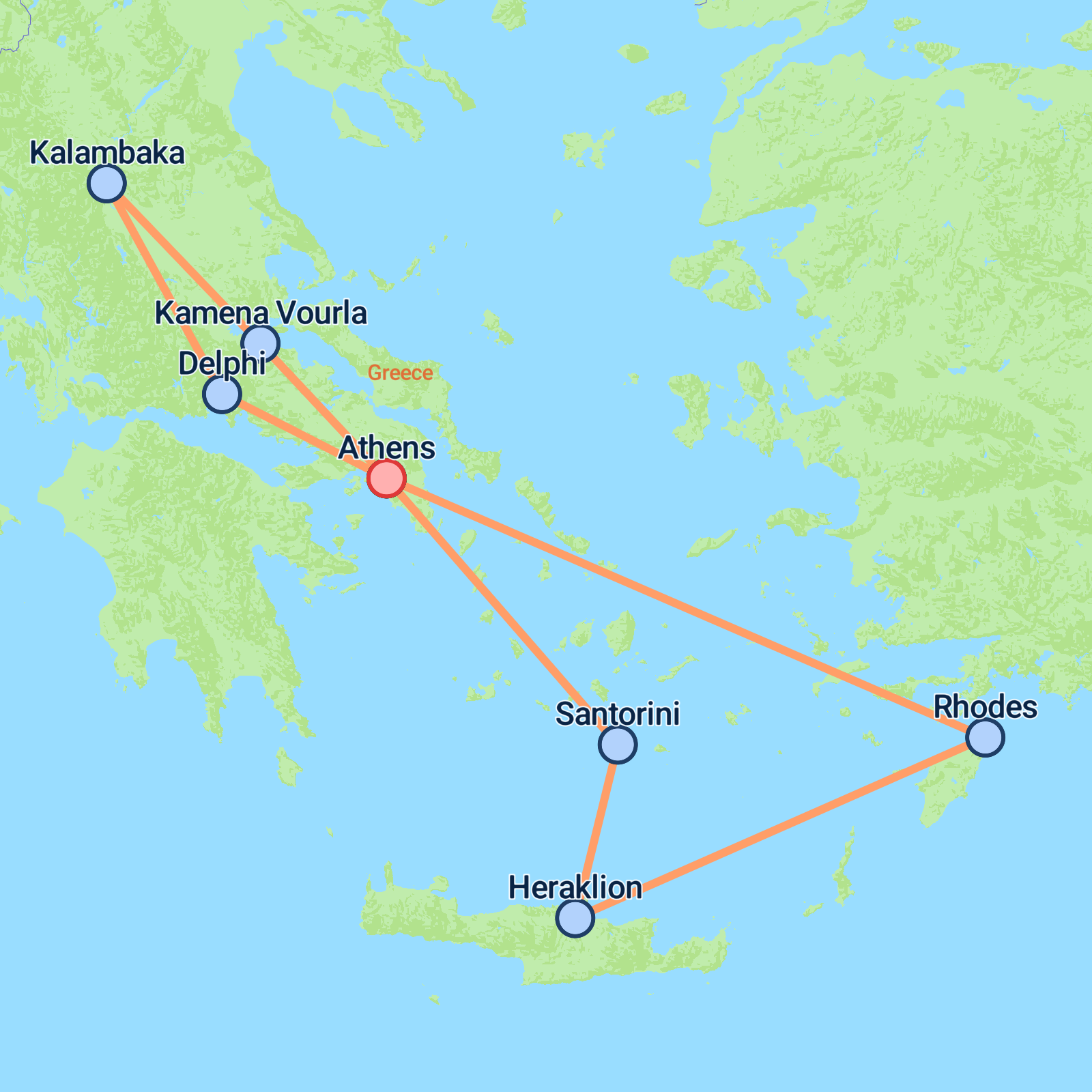 Embark on a captivating 12-day journey, starting and ending in the iconic city of Athens. Dive into the heart of Greek civilisation with a guided tour of Athens, including the stunning Acropolis. Travel overnight by ferry to Rhodes, where you'll explore a wealth of history within its ancient walls. A quick flight transports you to Crete, unveiling the wonders of the Palace of Knossos and the island's picturesque towns like Rethymno and Chania. Marvel at Santorinis breathtaking views before discovering the mystical monasteries of Meteora. Conclude your journey with a visit to Delphis awe-inspiring archaeological sites. Expect a perfect blend of history, culture, and stunning Mediterranean landscapes!